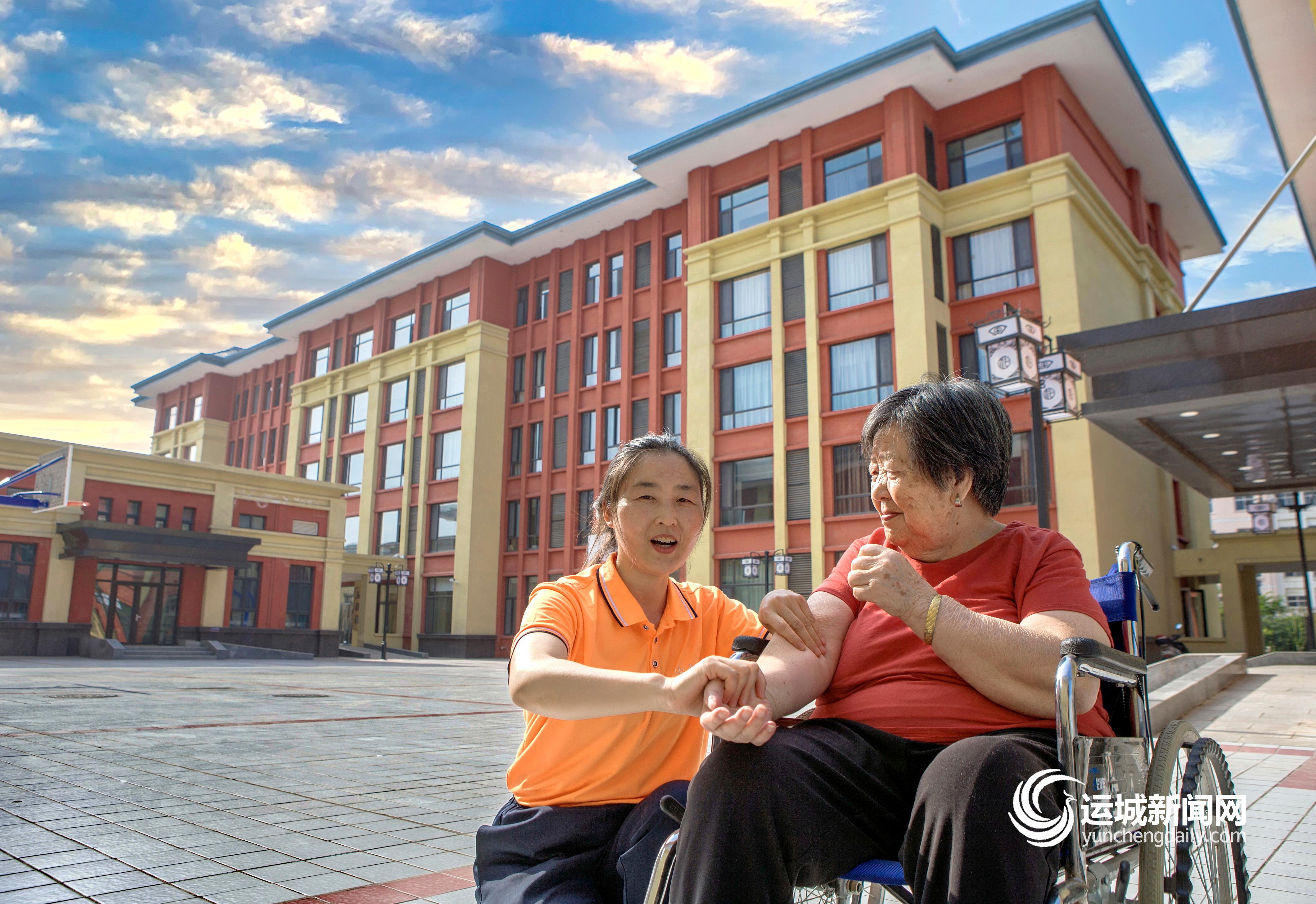 万荣县中企联发养老服务中心护理组组长张花花(左)说,医养结合让新时代的老人生活更安心,这都是党的好政策带来的福利。我们要坚定不移跟党走。