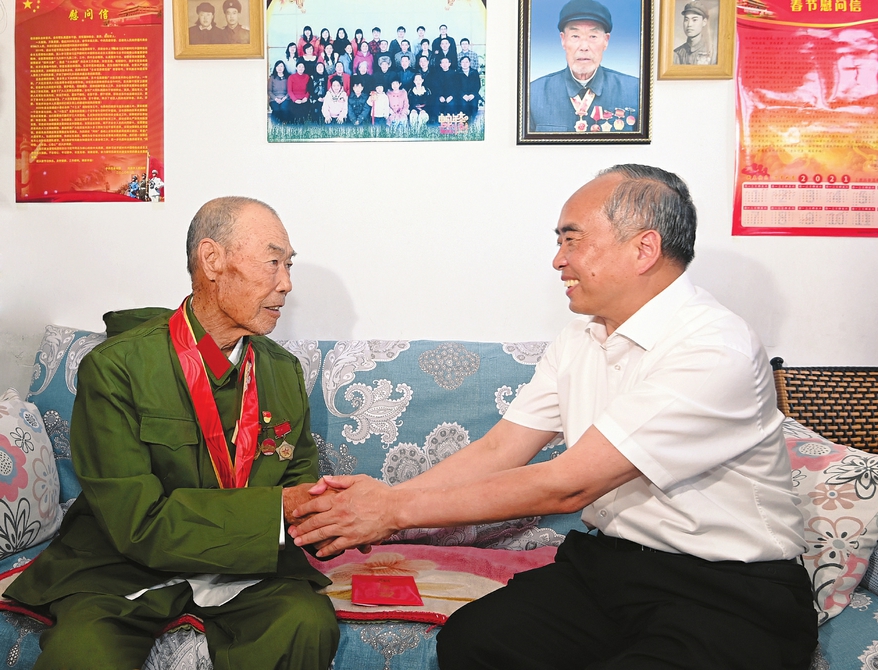六月二十六日,省委书记林武在吕梁市方山县,走访慰问退役军人老党员刘生裕,送上节日祝福,亲自为他佩戴“光荣在党五十年”纪念章。本报记者李联军摄