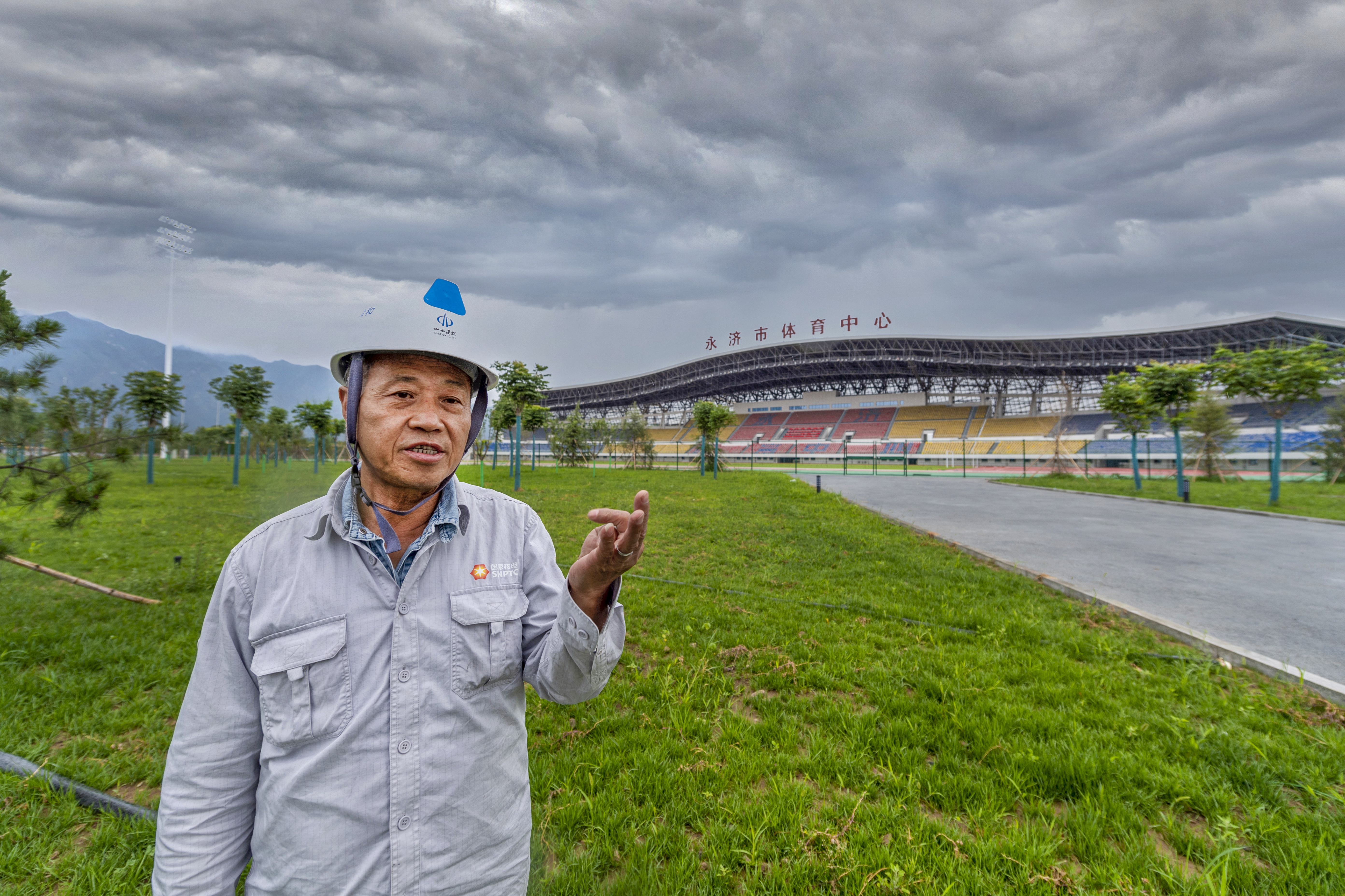 图⑥:李春雨在永济市体育中心“一场三馆”建设现场