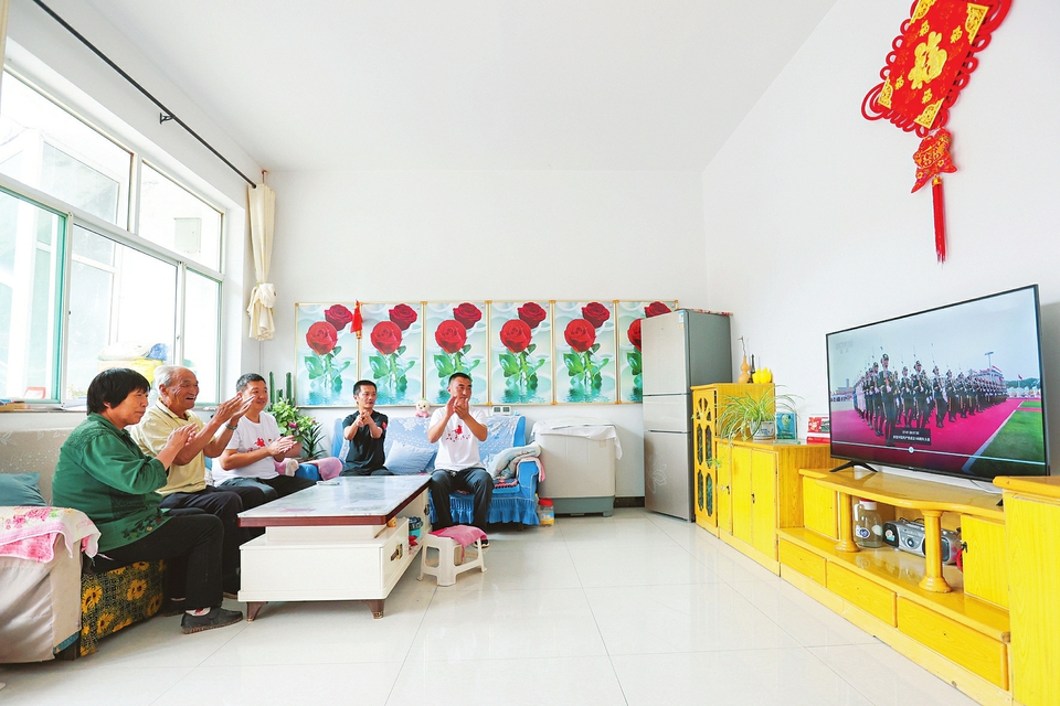 7月1日一早,平顺县西沟村脱贫户周爱松、李喜龙等聚在一起,通过电视收看庆祝中国共产党成立100周年大会直播,他们用热烈的掌声表达对党和国家帮助他们脱贫致富走上小康路的感恩之心和感激之情。王超摄