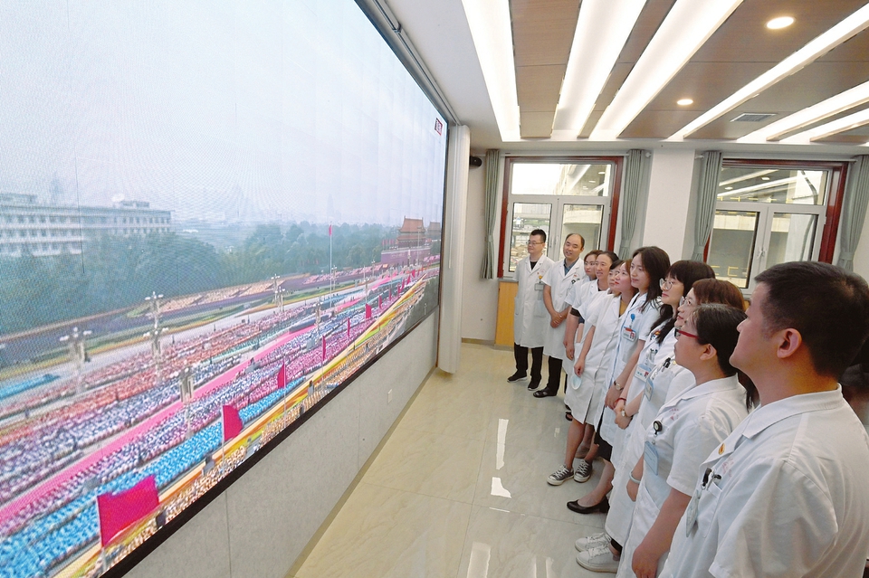 7月1日,山西医科大学第二医院西院医务工作者正在收看庆祝中国共产党成立100周年大会。本报记者阮洋摄