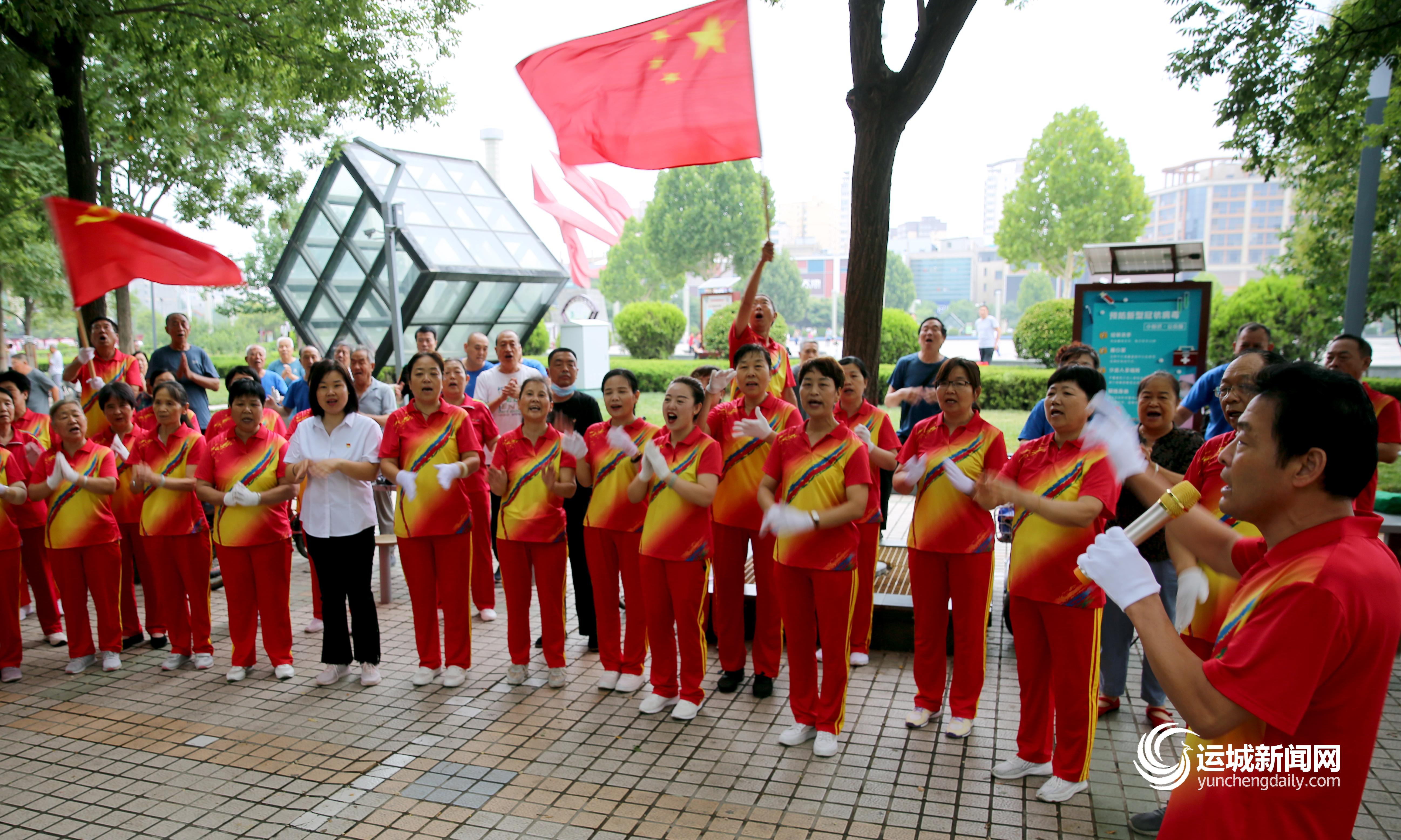 ▲7月1日,盐湖区东城办中央城社区金磊健身队的队员们,自发来到市区南风广场,集体合唱《没有共产党就没有新中国》《社会主义好》,用歌声为党庆生。 该社区党支部书记王小英说,金磊健身队成立于2014年,是居民自发组织的。随着人们对健康理念的追求,健身队由原来的几十人发展到现在的百人队伍。