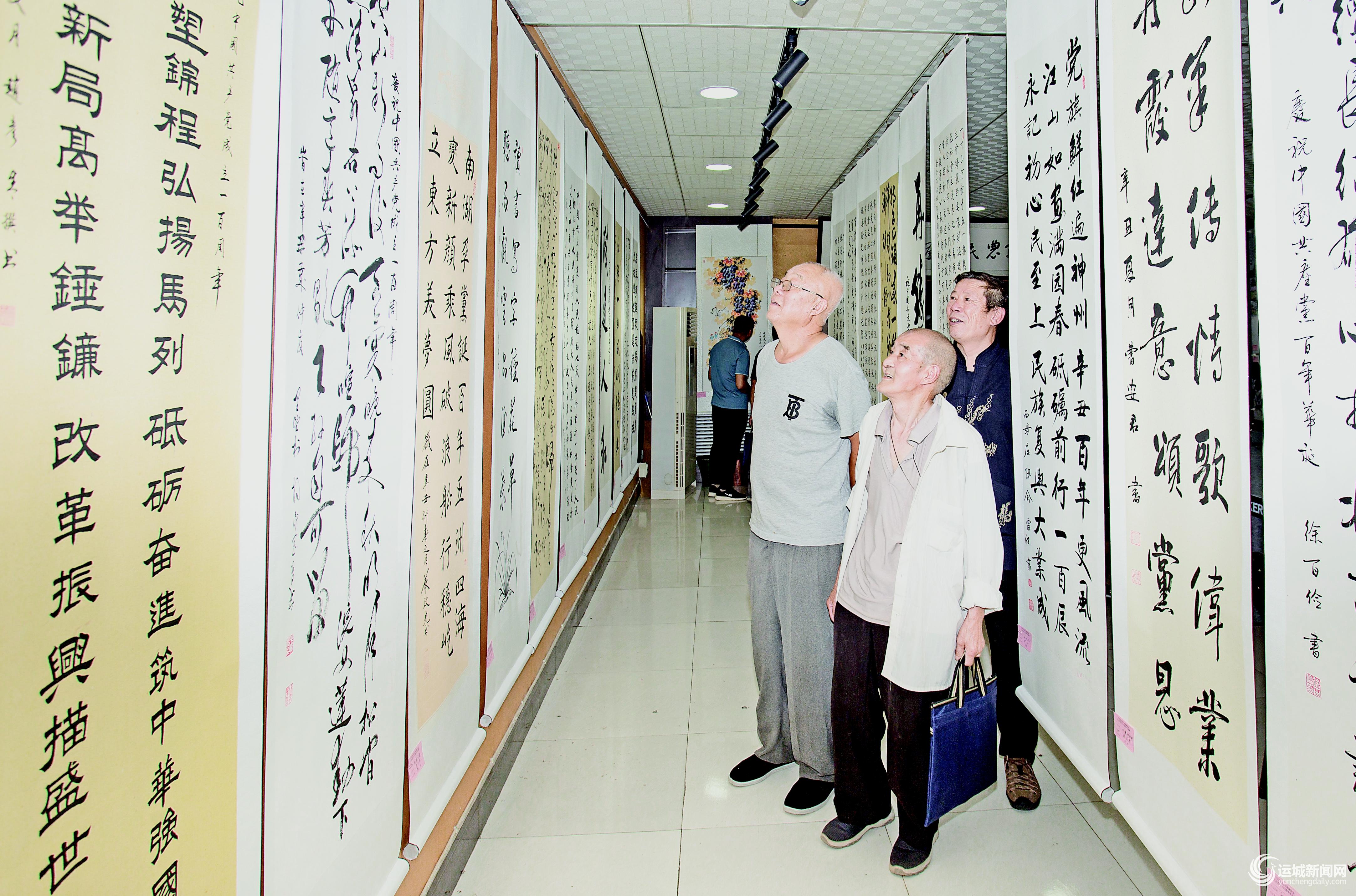 6月28日,几名书法爱好者在万荣八龙文化传媒有限公司展厅,欣赏农民书画作品。