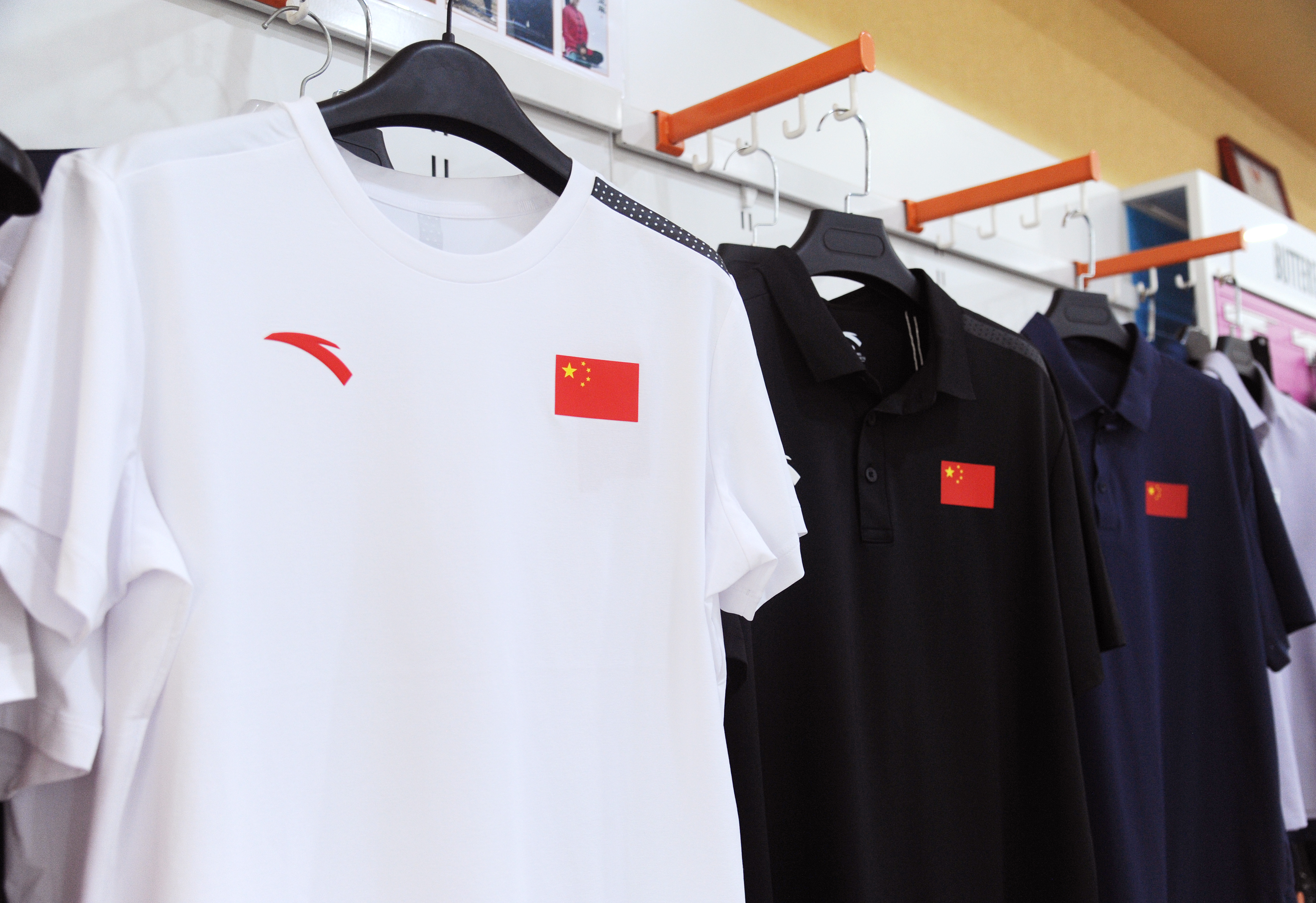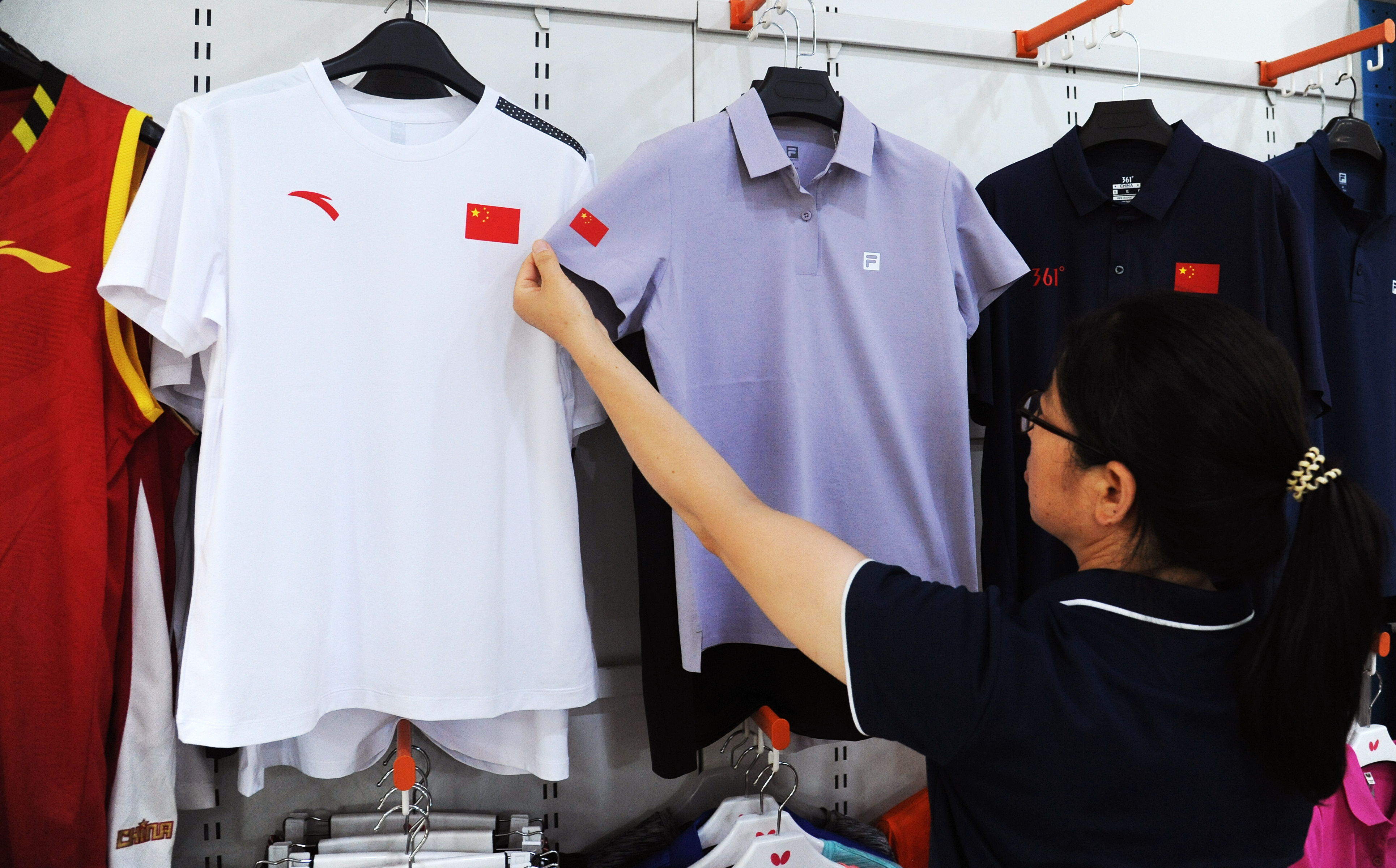 ▲7月1日,市区尚体运动商城,店员在整理国旗款运动服。