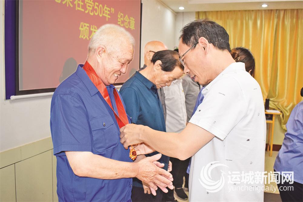 运城晚报讯(记者 张萌芝)“七一”前夕,万荣县非公党委举行“光荣在党50年”纪念章颁发仪式,为全县非公党支部党龄50年以上的老党员颁发纪念章(右图)。