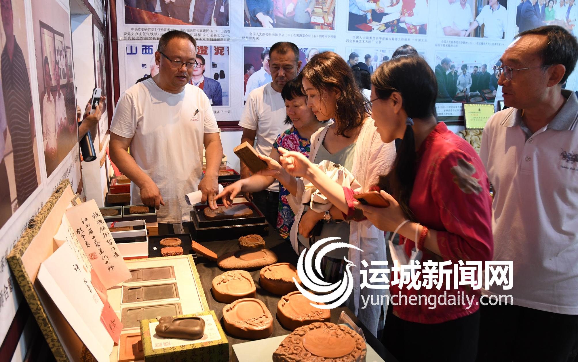 ▲国家级非遗传承人蔺涛(左一)向大家介绍澄泥砚