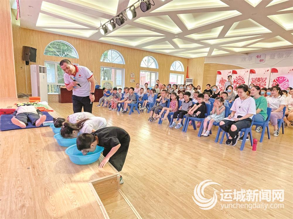 “请幼儿们上台来进行水中闭气,大概了解溺水是什么感觉,以后提高警惕,避免落水。”当天,盐湖区红十字会应急救援大队大队长王刚带领幼儿学习防溺水知识。