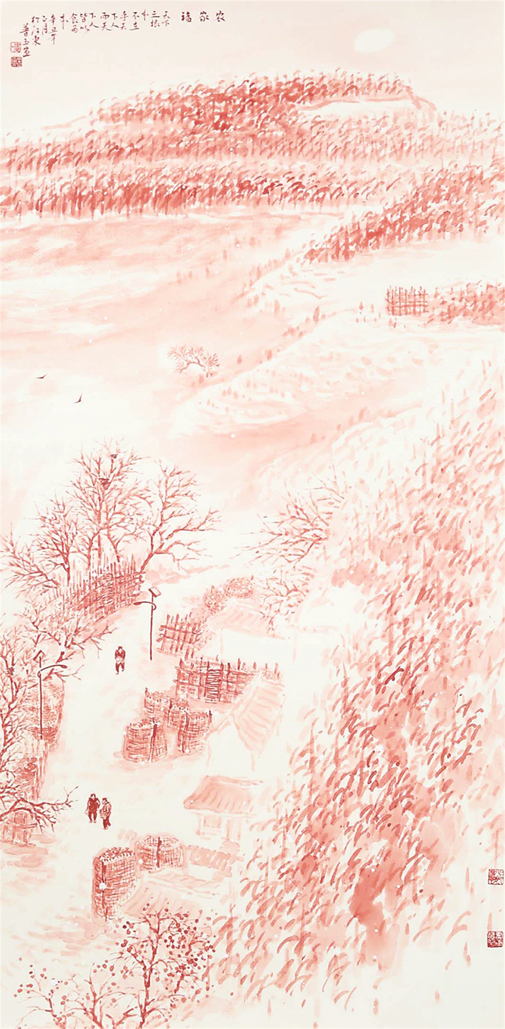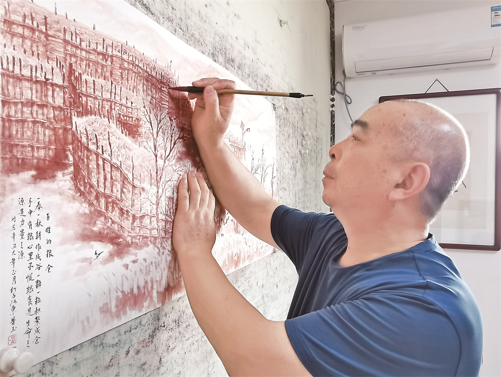 该系列作品的鲜明特点是朱砂入画,秉承中国传统技法,融入现代绘画元素,独具特色地用中国红呈现头等大事——中国粮仓。