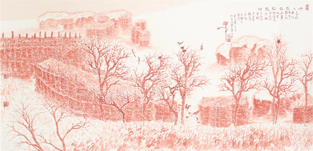 正如北京知名画家孙良利所赞:“以朱砂作画,虽非独创,但以朱砂表现中国粮仓成为系列,积色多遍、浑厚华滋、构图饱满、意境雄阔,实乃大手笔也!”