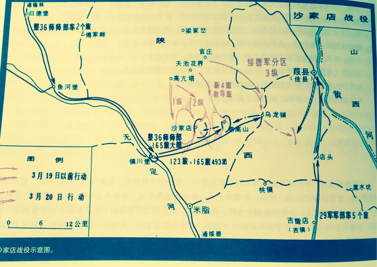 19日,刘戡率主力进占葭(佳)县城、神泉堡、李家庄等地。钟松率后梯队刚通过沙家店,即发现西北野战军主力正快速向沙家店方向集结,对其形成包围之势。钟松一面命令部队占领阵地,抢筑工事,一面急电刘子奇,令其前梯队123旅向沙家店靠拢。123旅因畏惧我军伏击与夜战,决定派附属的493团先行驰援。