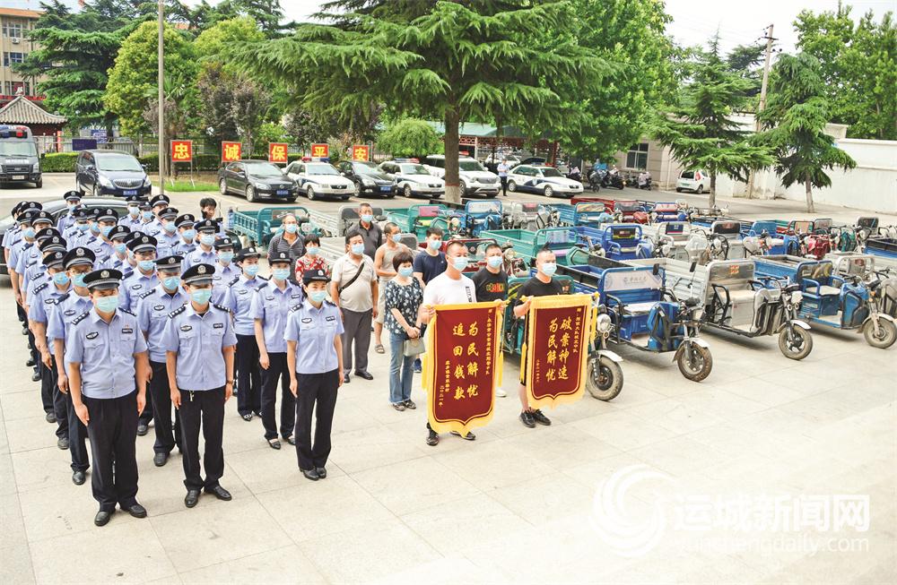 永济市公安局返还仪式上,刑侦大队对收缴的现金、汽车、电动三轮车、手机、音响等部分涉案财物进行公开返还,最大限度地减少受害群众的经济损失。看到被盗的物品失而复得,受害群众脸上露出喜悦的笑容,并向办案单位赠送了锦旗。