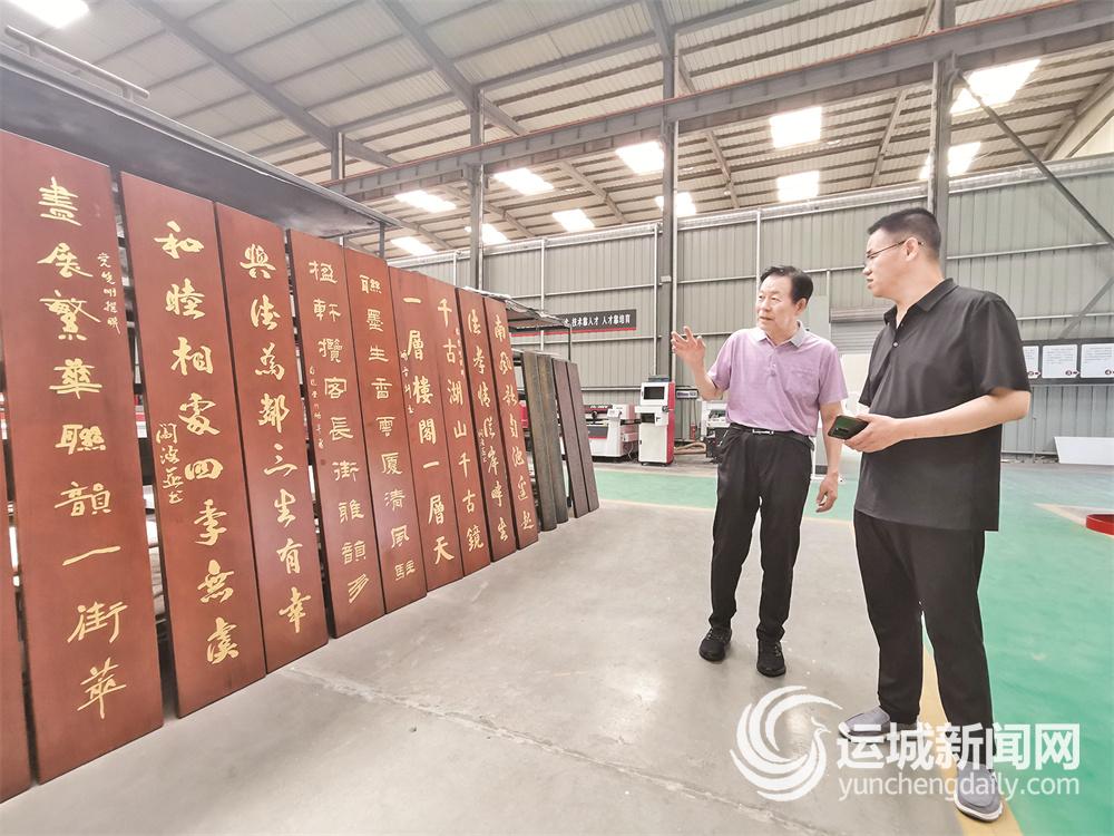马文海(左)在中国楹联制作基地了解楹联产业化发展形势