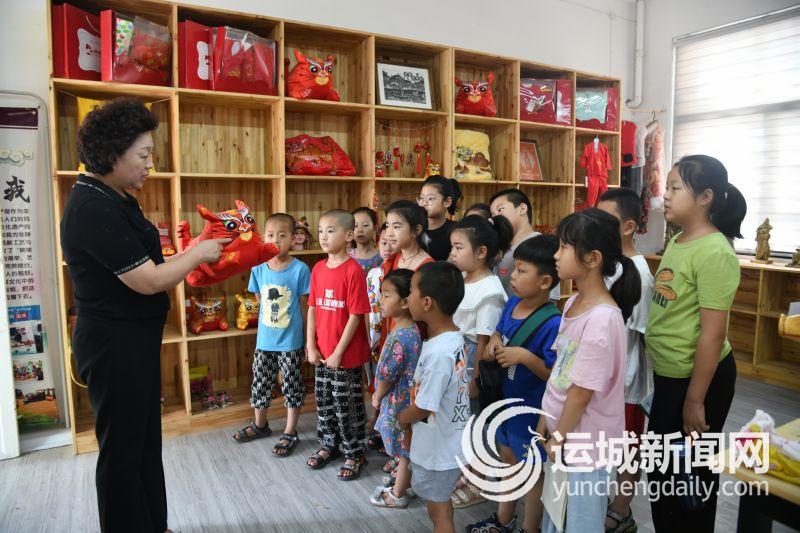 7月8日,闻喜县侯村镇寺底村留守儿童在村里的文明实践站非物质文化遗产展览馆参观学习,听村委会主任吉平娟介绍非物质文化遗产——老虎布艺。