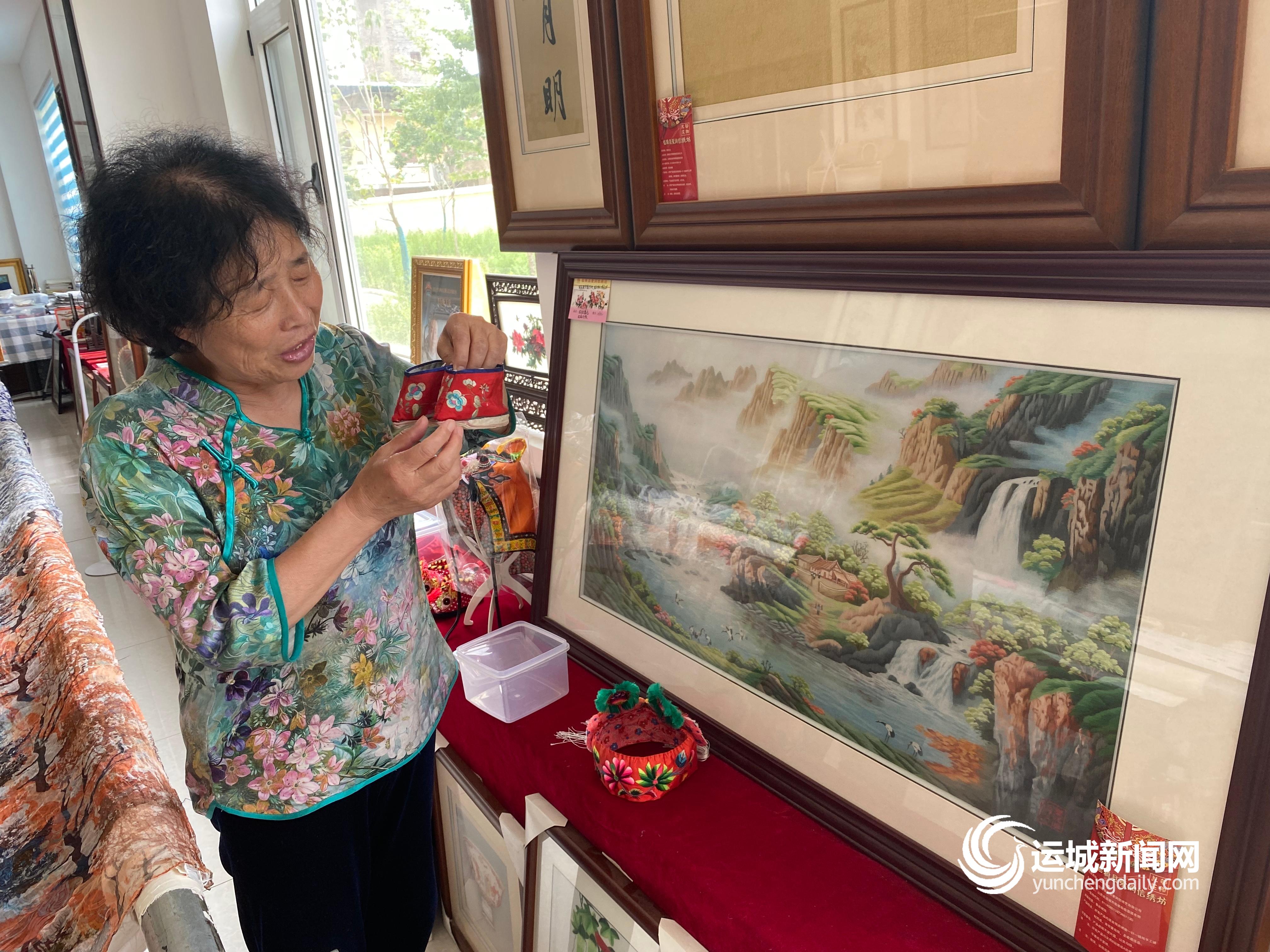 走出猗氏镇文化站排练室,一片空旷的广场可供村民们跳跳广场舞、健美操,排练室旁边的书画创作室里,陈列着村民们自主创作的书画作品、临猗花馍、扎花作品等。