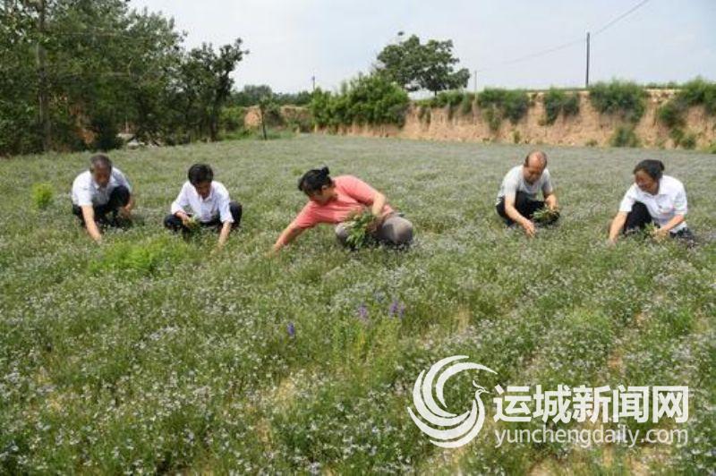 ▲7月9日,运城市口腔卫生学校驻闻喜县阳隅镇吴吕村工作队队员,帮助村民在药材地里拔草,加强中药材夏季管理。