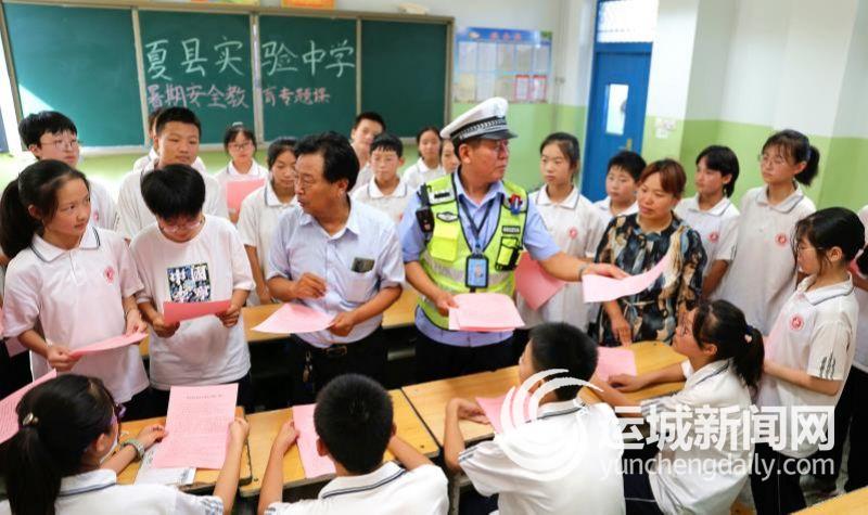 当天,夏县实验中学校长张银刚重申了“五严禁”要求:严禁学生到水库、河边游玩;严禁学生单独外出;严禁不戴头盔骑行电动车;严禁孩子购买“三无”食品;严禁孩子沉迷手机延误暑假作业。随后,张银刚与夏县交警大队民警一起向学生发放了交通安全宣传资料,嘱咐学生平平安安过暑假。