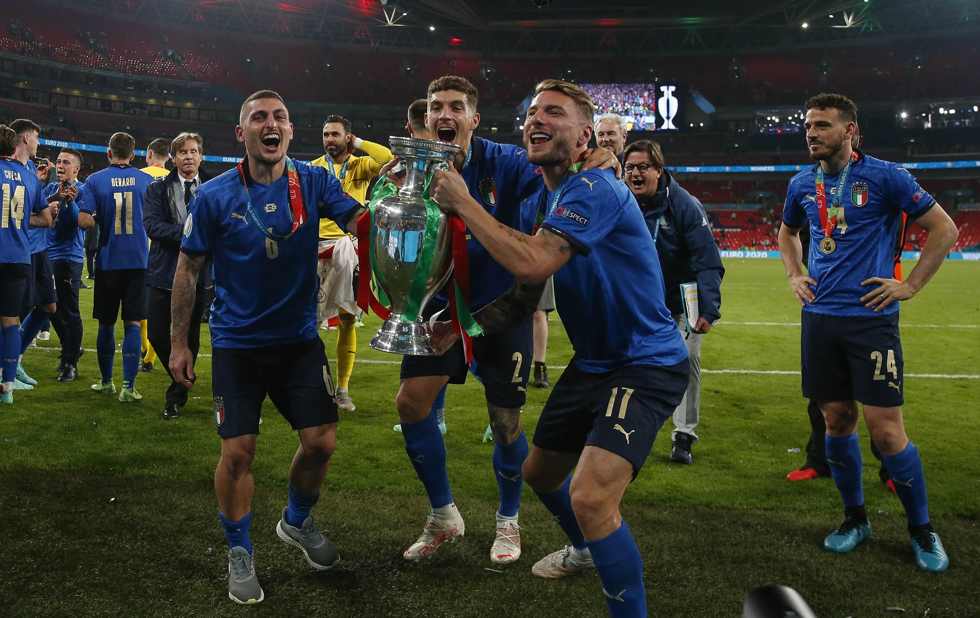 7月11日,意大利队球员举起奖杯庆祝夺冠。 新华社记者 韩岩 摄