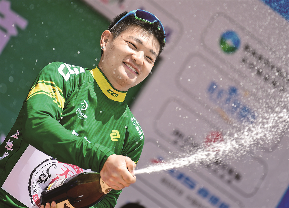 7月15日,青海天佑德车队选手李自森身着代表冲刺总积分第一名的绿衫在领奖台上喷洒香槟庆祝。 当日,第二十届环青海湖国际公路自行车赛进行第五赛段——共和至西海镇的角逐。