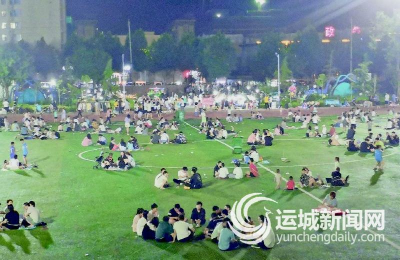 ▲7月16日晚,人们在万荣县文体中心体育场纳凉消夏。
