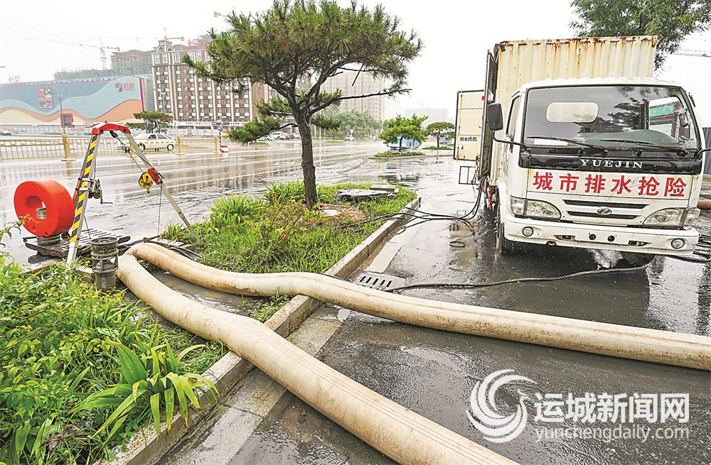 7月20日,在学苑路和大禹街交叉路口,市城市管理局排水服务中心设立的应急防汛泵车在抽水排水。
