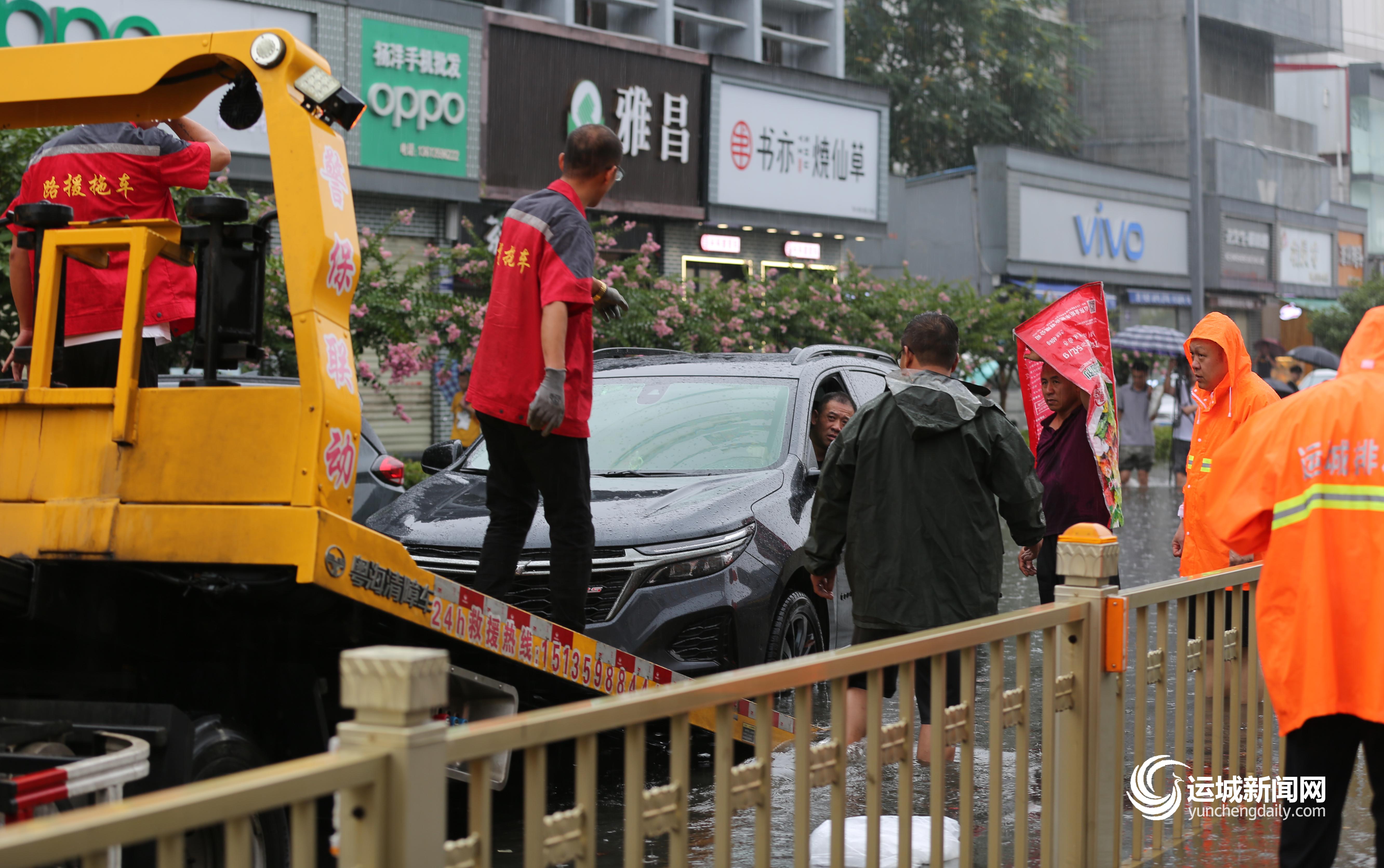 当天,我市突降大雨,市区解放路东侧的路援拖车工作人员在紧张地拖运在水中抛锚的车辆。