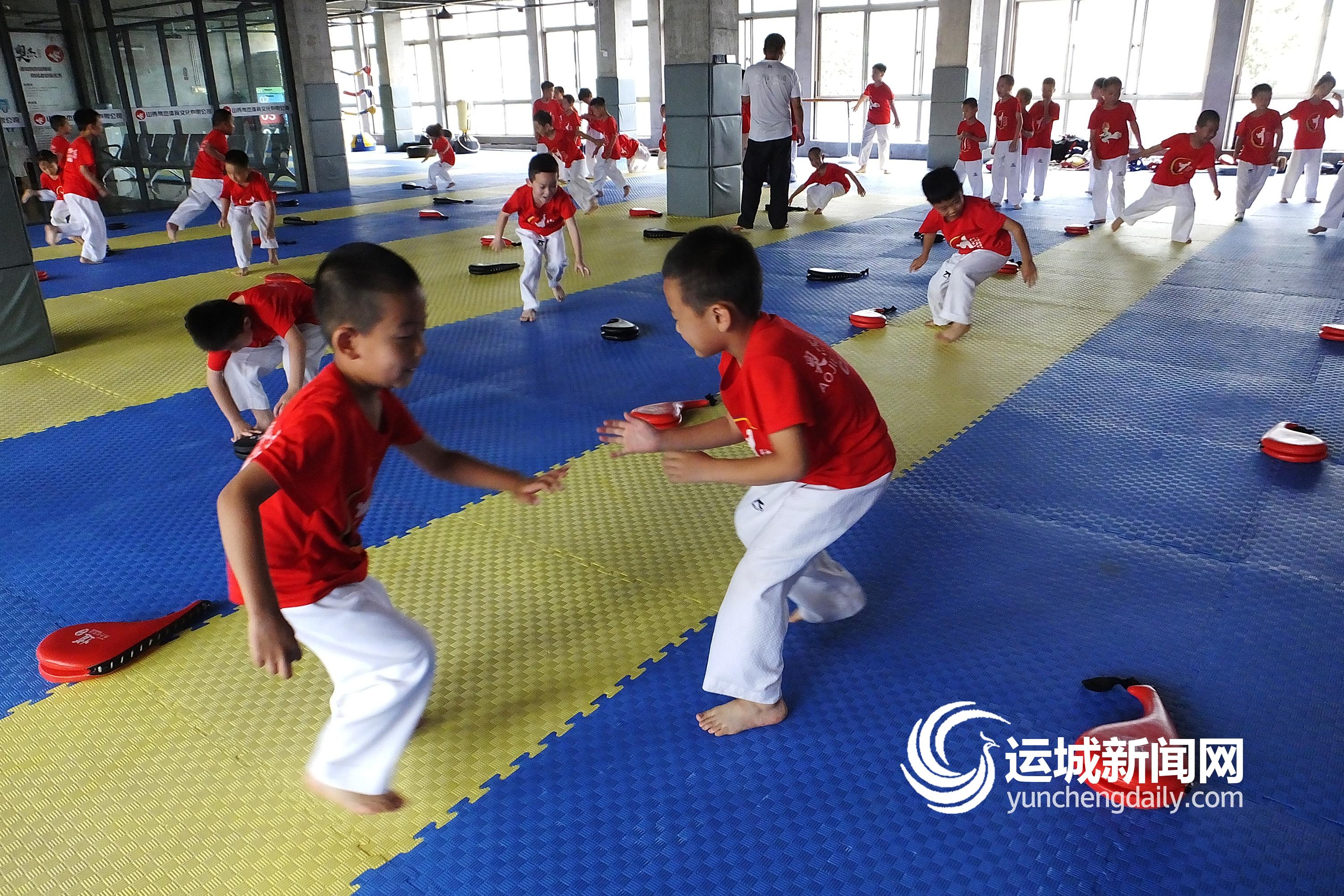 7月20日,中小学生在新绛县一家武馆练习跆拳道基本功。 暑假期间,新绛县不少中小学生选择学习跆拳道、武术等,强身健体,磨练意志,丰富暑期生活。 特约摄影 高新生