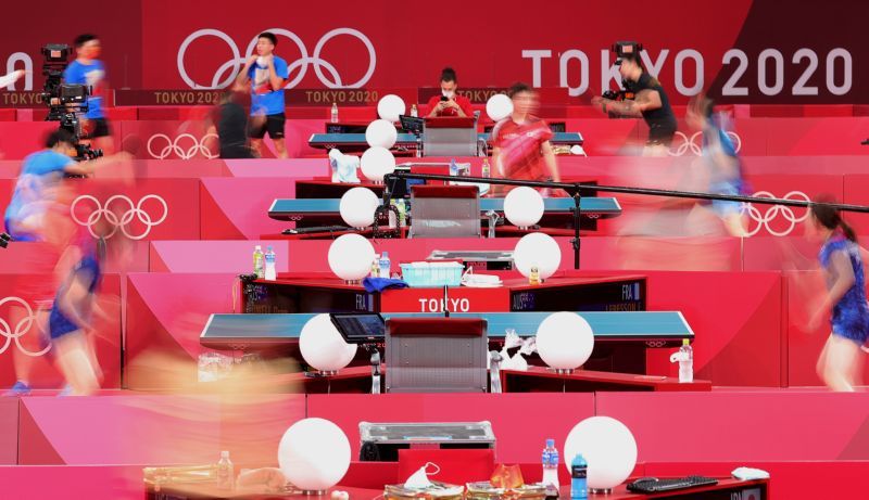 当日,中国乒乓球队继续在东京体育馆进行赛前训练,备战东京奥运会比赛。