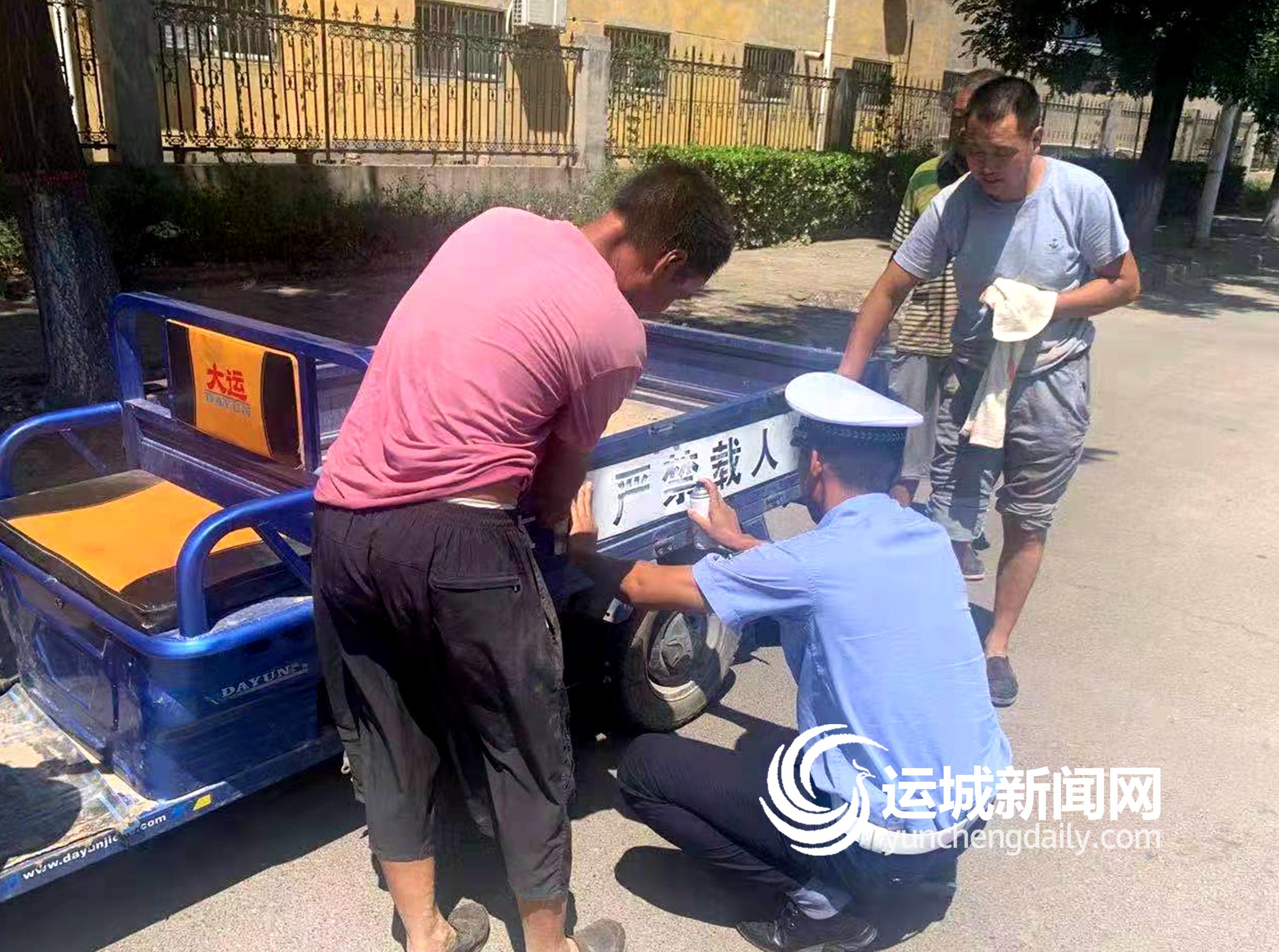 各县(市、区)在做好宣传引导工作的同时,还在各村口设立检查点,禁止三轮车载人上路行驶,严厉打击三轮车载人违法行为,预防和减少农村道路交通事故发生。7月9日,夏县交警大队组织民警在辖区路段开展三轮车无牌无证、载人等违法行为专项整治行动,连续查处4起三轮车违法行为。