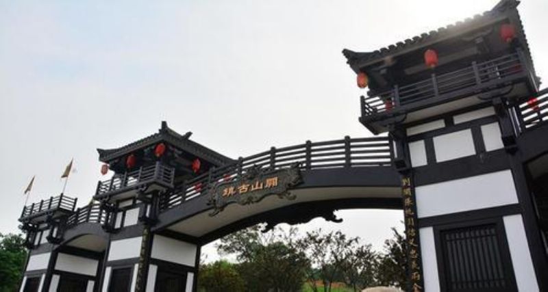 关山古镇景区大门,高大宽阔、气势端庄,上有工艺考究的哨楼和连桥,下有勇猛威严的兵勇和石兽。大门两旁楹联“刘关张桃园结义义忠两全赢天下,魏蜀吴关山雷战金戈铁马聚英豪”为景区董事长朱志明所撰。大门左侧城墙上镌刻的200余字《关山赋》,承载着关山岁月留下的记忆与痕迹。