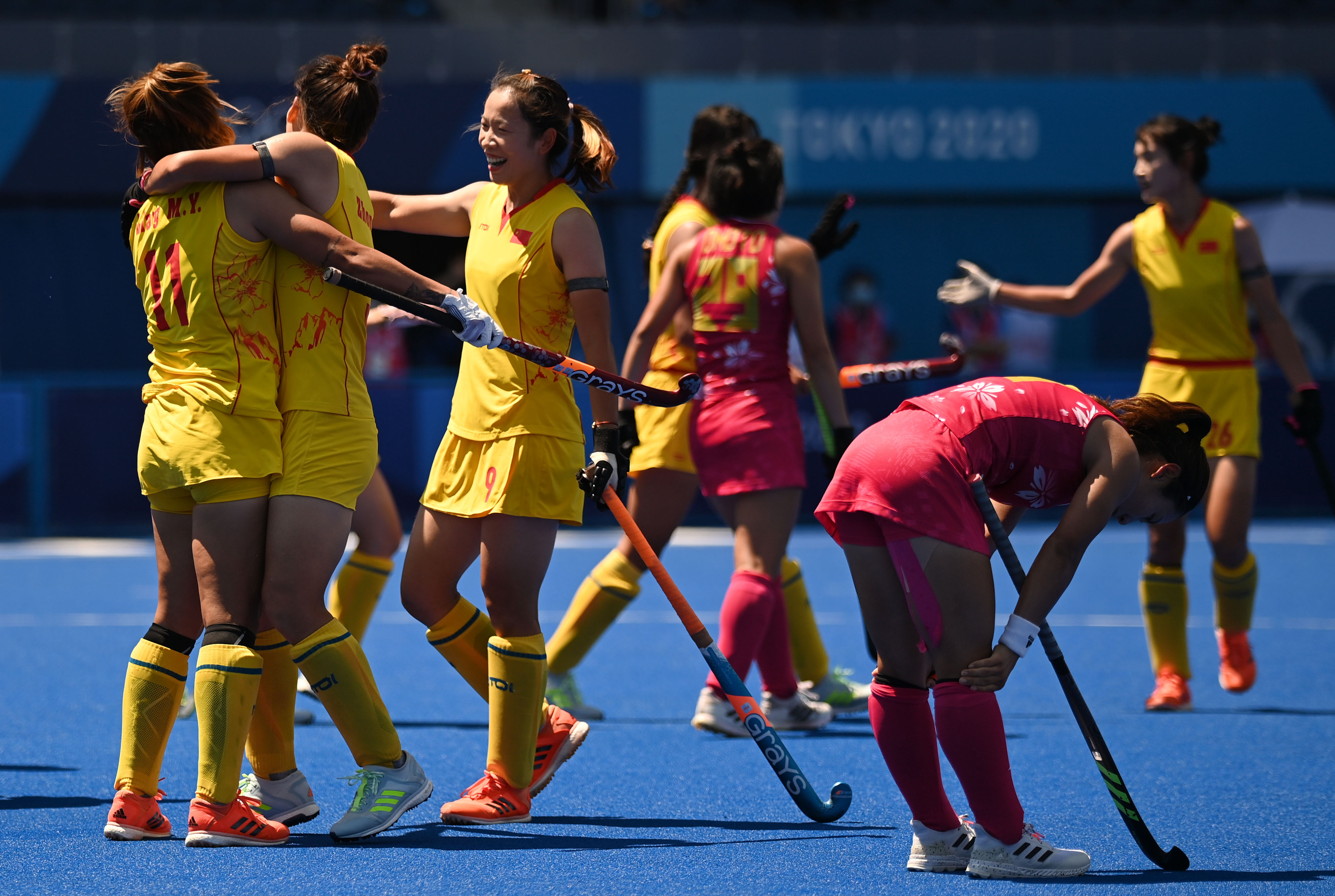 ▲7月25日,中国队队员庆祝取得制胜球。当日,在东京奥运会女子曲棍球小组赛中,中国队4:3战胜日本队。 新华社记者 李尕 摄