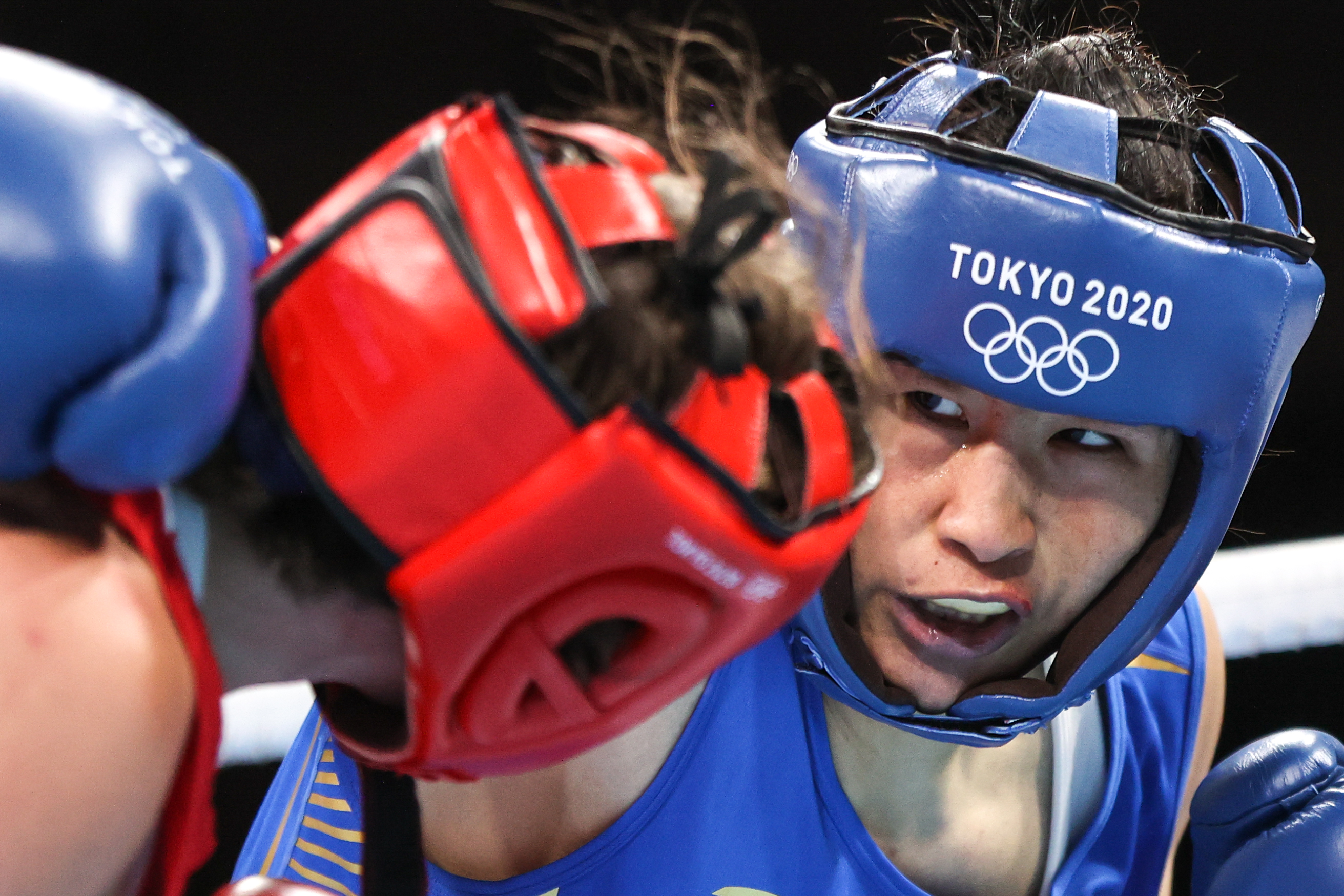 ▲7月28日,中国选手李倩(蓝衣)在比赛中。 当日,在东京奥运会拳击女子中量级(69-75公斤)八分之一比赛中,中国选手李倩战胜爱尔兰选手阿依弗·欧鲁克,成功晋级。新华社记者 欧东衢 摄