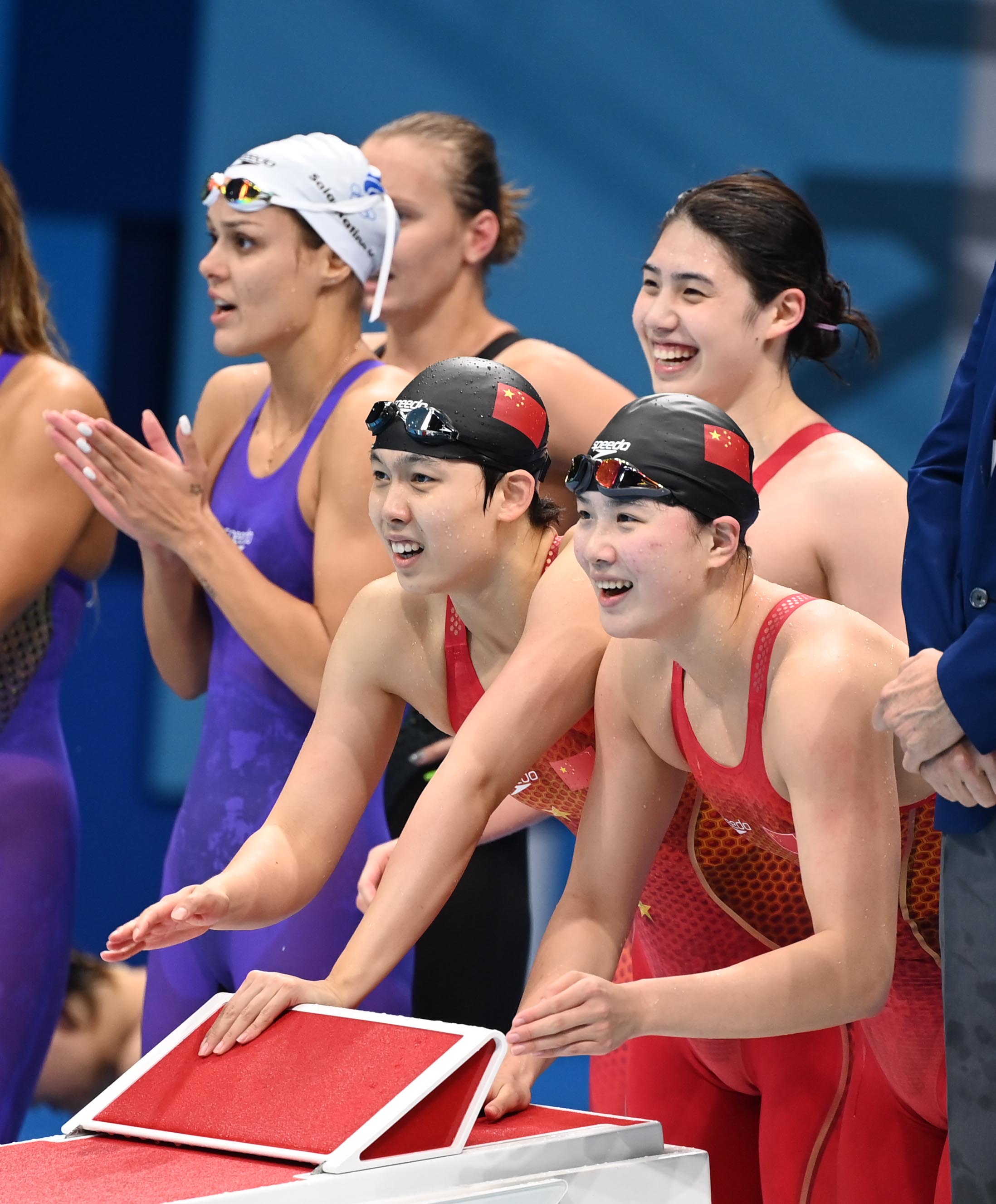 ▲7月29日,中国队选手庆祝夺冠。 当日,在东京奥运会游泳女子4X200米自由泳接力决赛中,中国队夺得冠军。 新华社记者 丁旭 摄