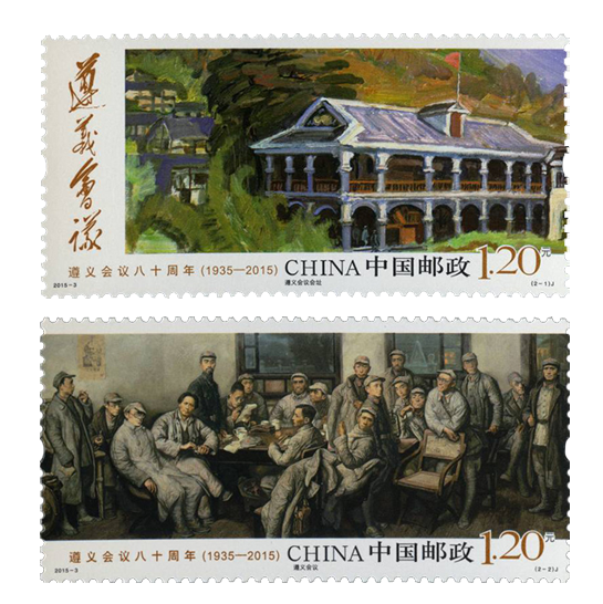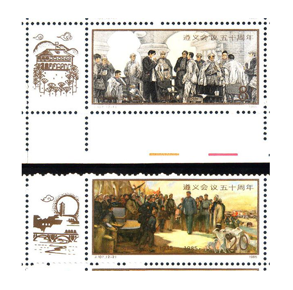 1985年1月15日,为纪念遵义会议召开50周年,邮电部发行《遵义会议五十周年》纪念邮票,一套两枚,志号为J.107。邮票图案名称分别为《遵义会议》(2-1)、《红军胜利到达陕北》(2-2)。