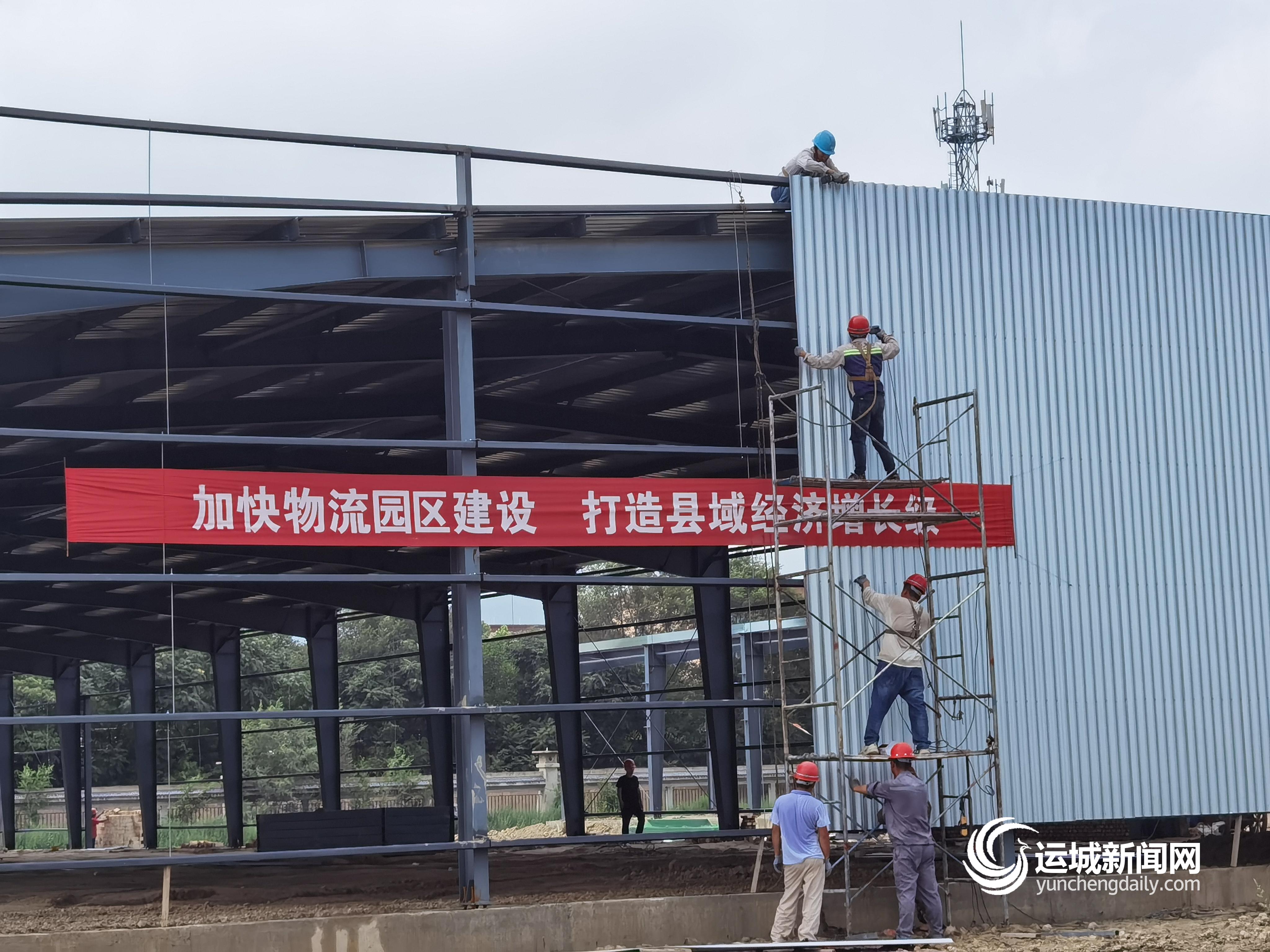 7月22日上午,记者在永济市久鼎物流园项目建设现场看到,工人们正在仓库房顶安装线缆,挖掘机有序运行,第一间仓库的板材也即将铺装完毕……