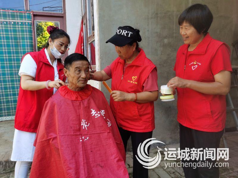 在几位“老兵”家里,志愿者细心询问他们的身体情况及家庭生活情况,并为他们提供理发(上图)、剪指甲、洗脚等服务。