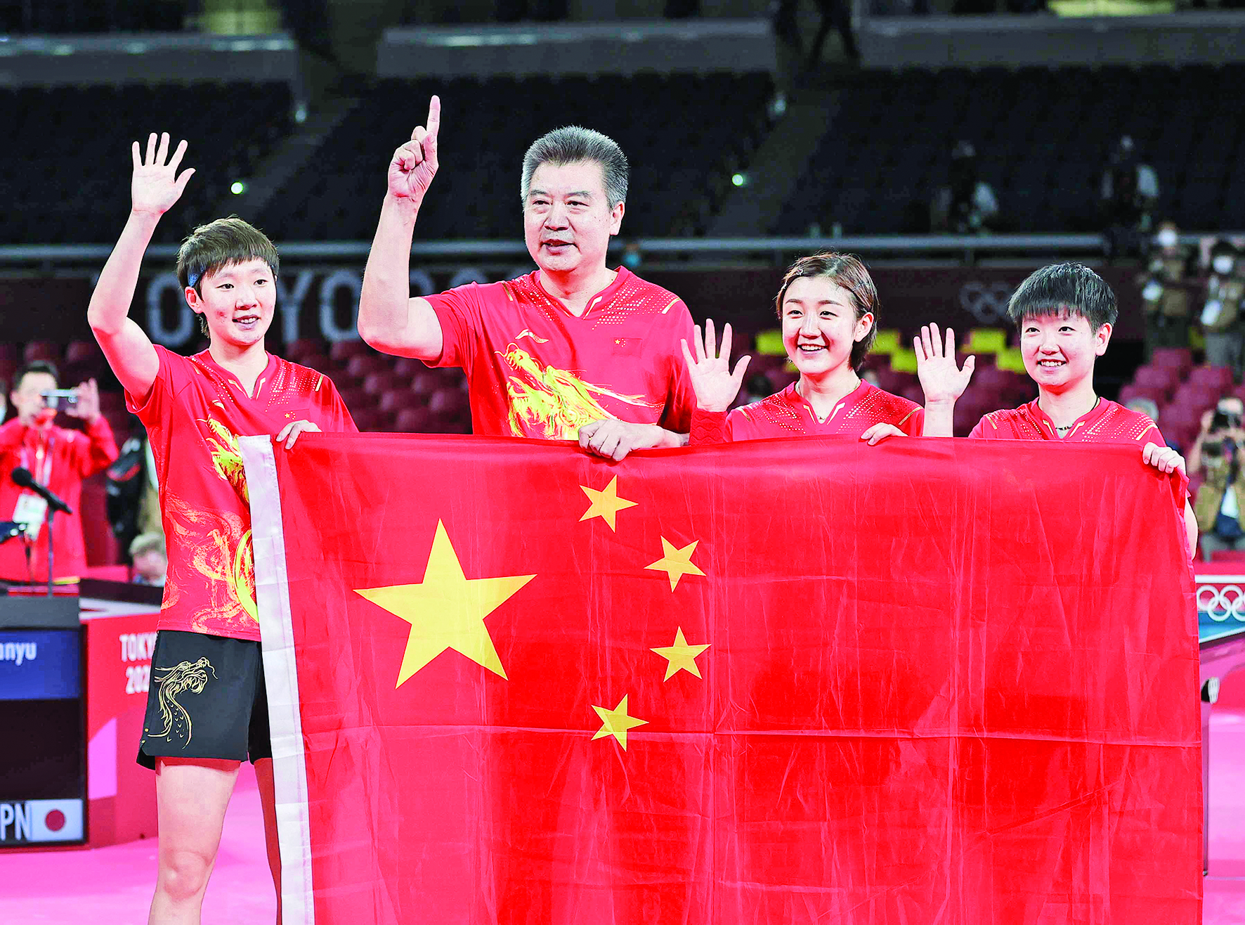8月5日,中国队教练李隼(左二)和选手陈梦(右二)、孙颖莎(右一)、王曼昱庆祝胜利。当日,在东京奥运会乒乓球女子团体决赛中,中国队战胜日本队,夺得冠军。 新华社记者 王东震 摄