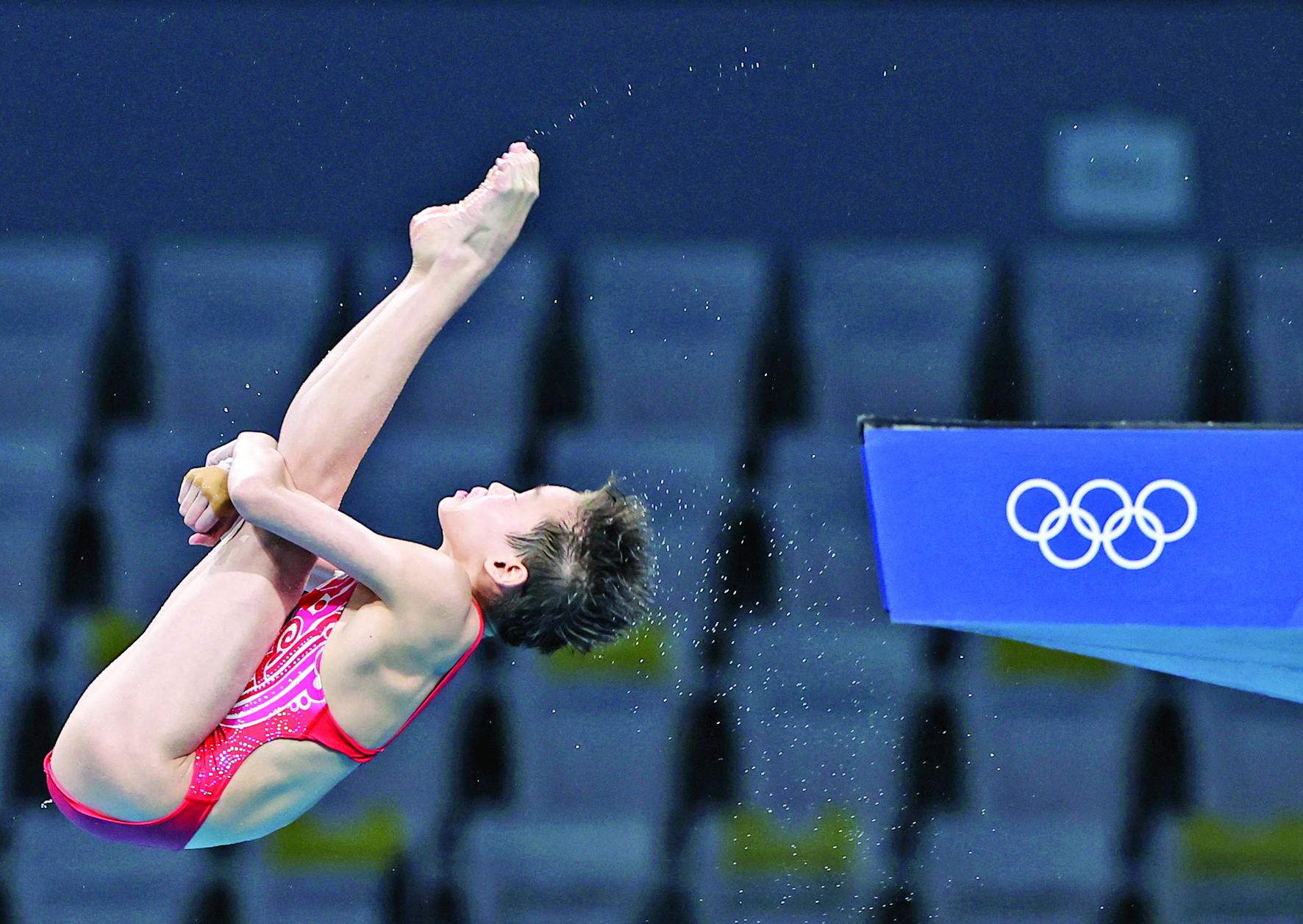 8月5日,中国选手全红婵在比赛中。当日,在东京奥运会跳水项目女子10米跳台决赛中,中国选手全红婵夺得冠军,陈芋汐获得亚军。 新华社记者 丁旭 摄