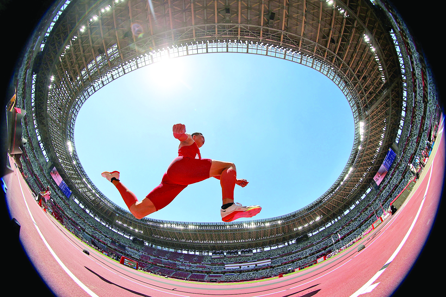 8月5日,朱亚明在比赛中。当日,朱亚明在东京奥运会田径男子三级跳决赛中获得银牌。 新华社记者 李明 摄