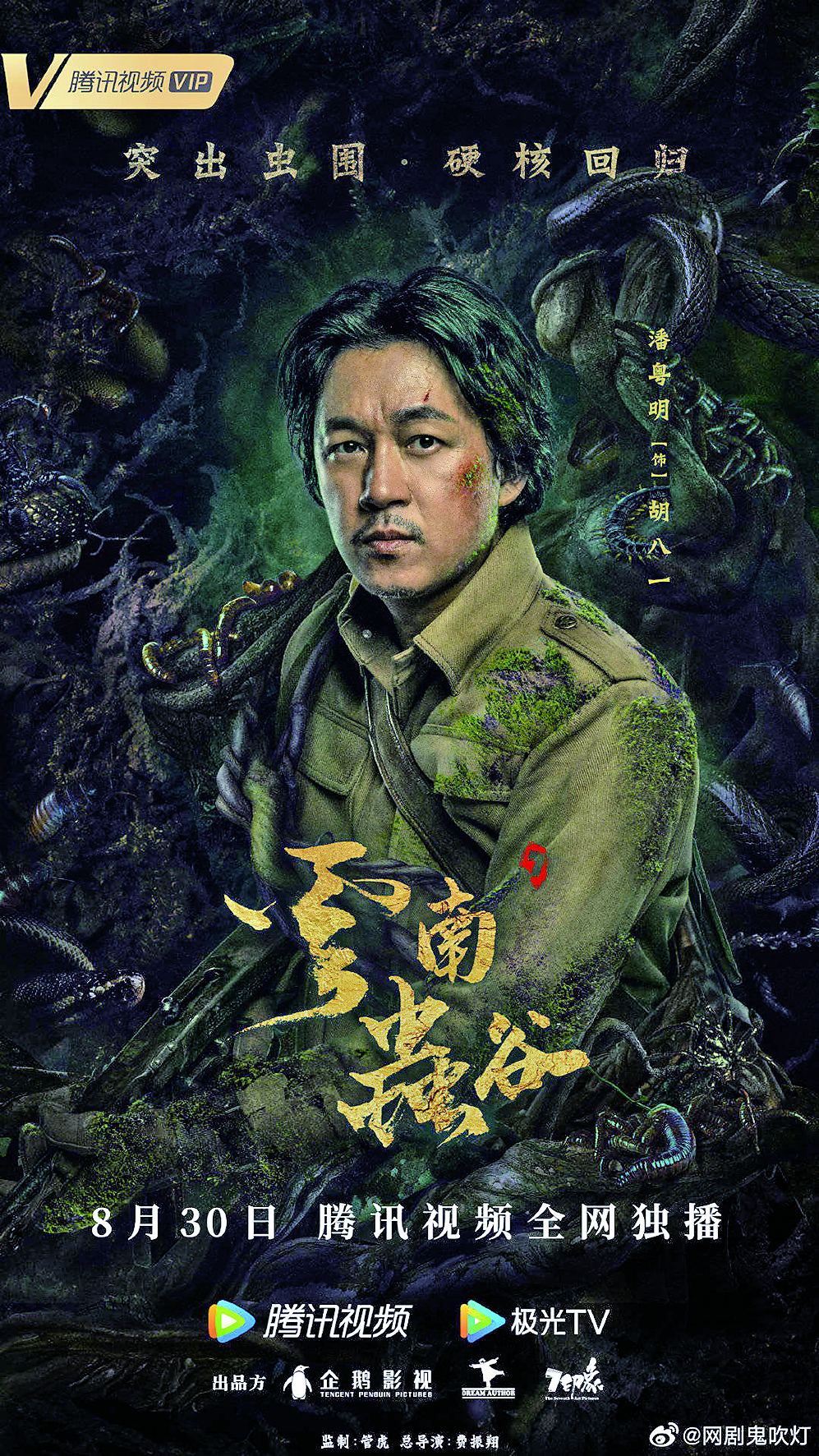 8月5日,网剧《鬼吹灯》在官方微博发布海报,宣布《云南虫谷》将于8月30日起在腾讯视频全网独播。官方微博配文称:“铁三角胡八一(潘粤明饰)、shirley杨(张雨绮饰)、王胖子(姜超饰)神色沉浮,暗藏心绪。海报信息量十足,奇虫异兽令人眼花缭乱。”