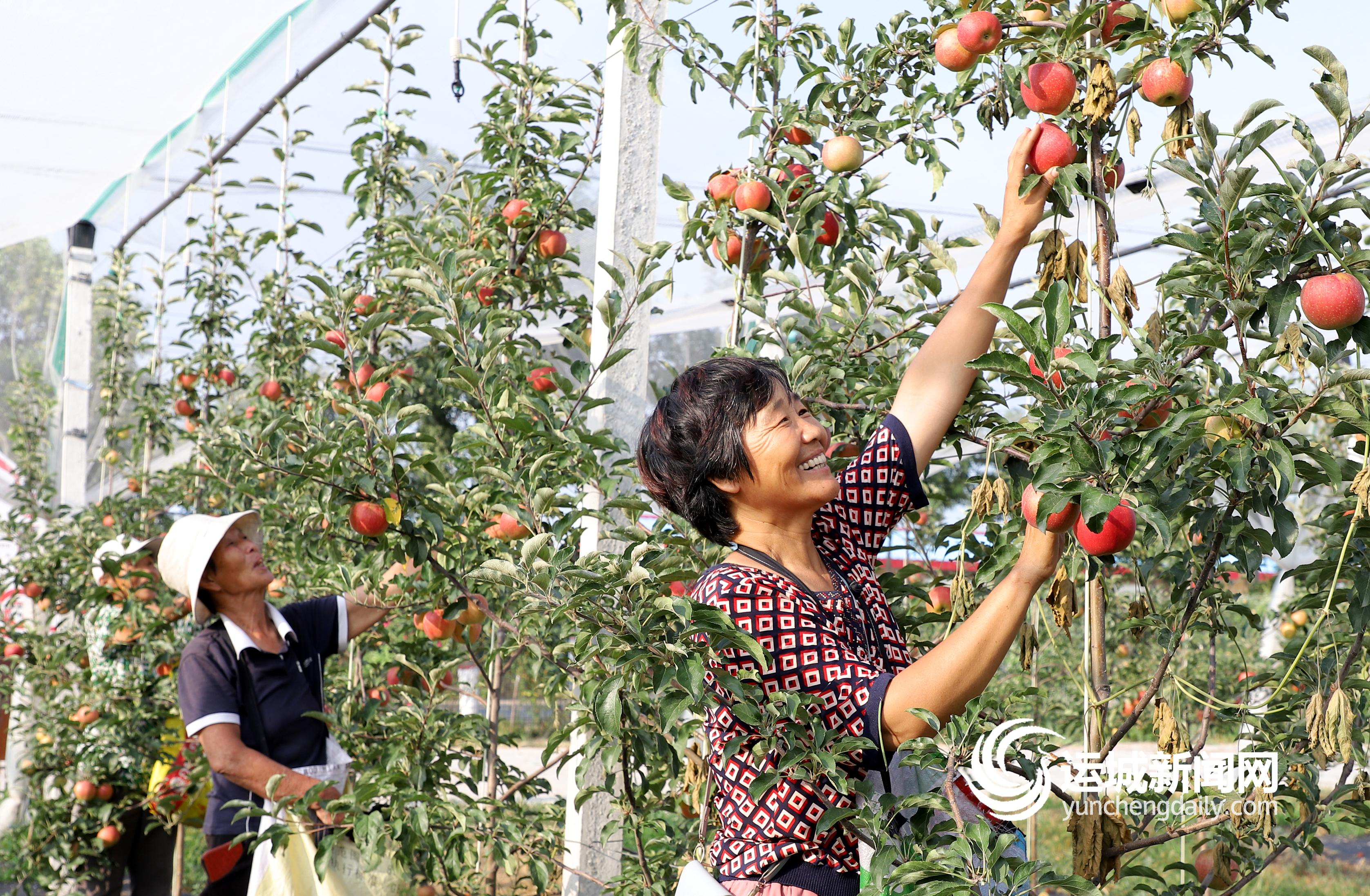 8月4日,在临猗现代苹果产业示范园(北辛乡东卓基地),果农们在采摘新上市的“大卫嘎啦”苹果。