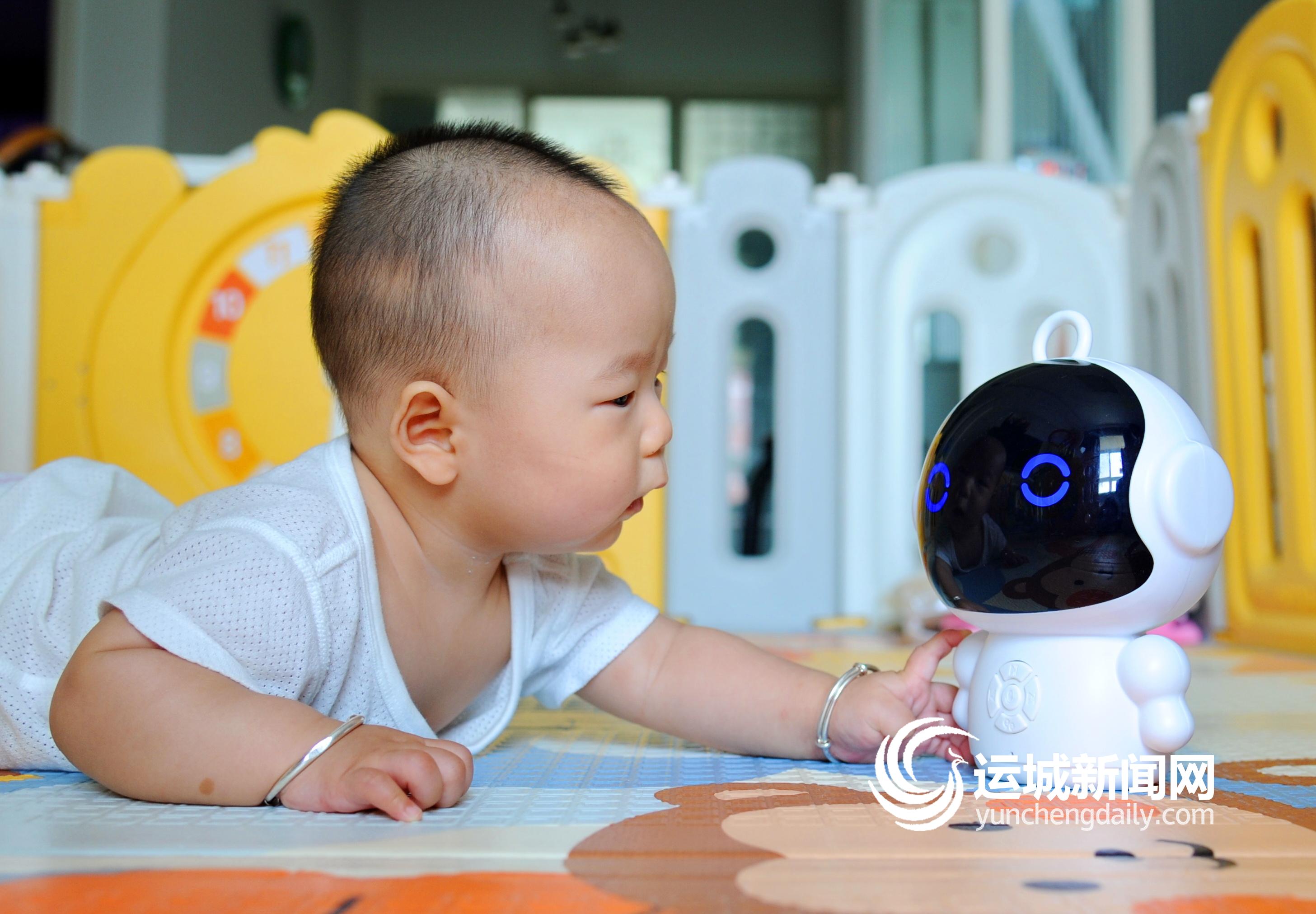 ▲“叮叮当、叮叮当……”近日,市民张先生家,不满1周岁的小芒果与机器人小谷在互动。