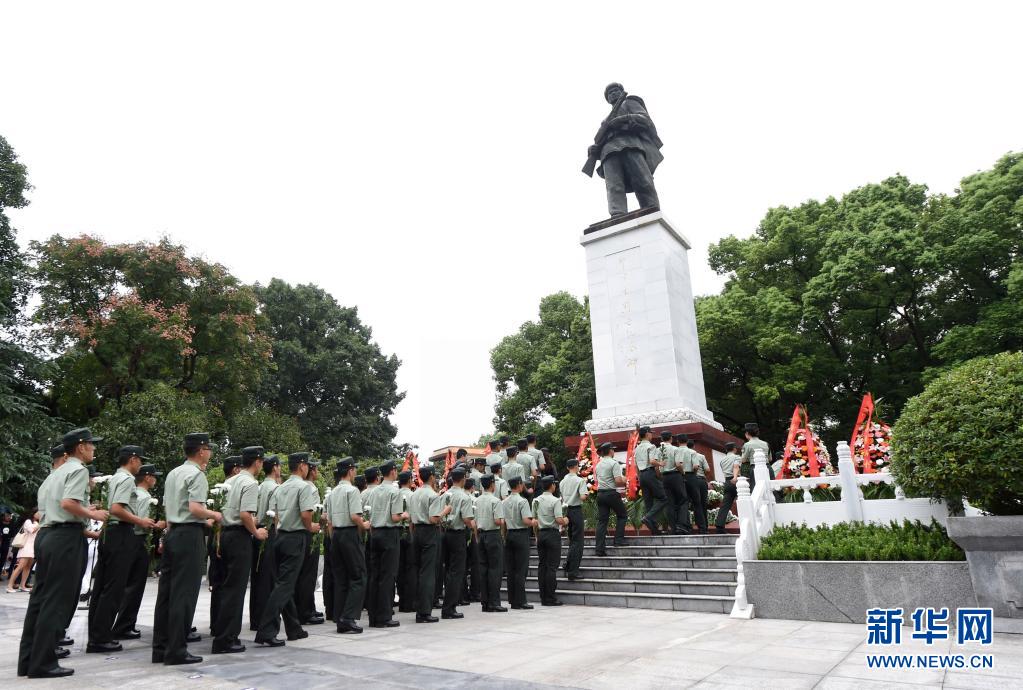 在位于重庆市铜梁区的邱少云烈士纪念馆,武警官兵向邱少云烈士纪念碑献花(2017年9月30日摄)。新华社记者 唐奕 摄