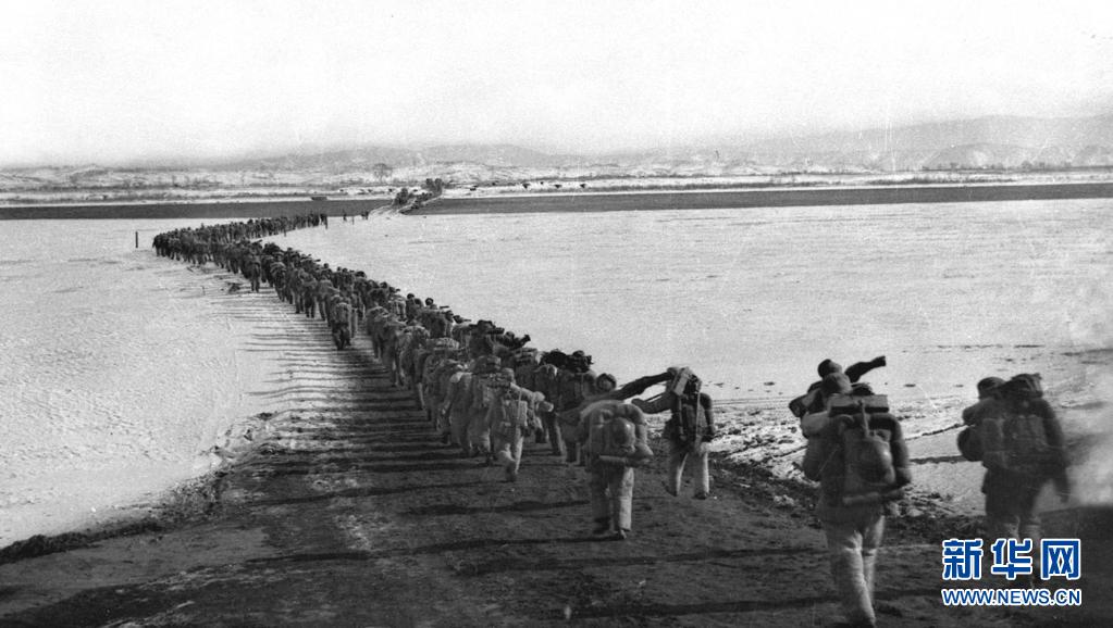 1950年10月19日,中国人民志愿军雄赳赳、气昂昂跨过鸭绿江,和朝鲜人民一道共同抗击侵略者。新华社发(黎民 摄)