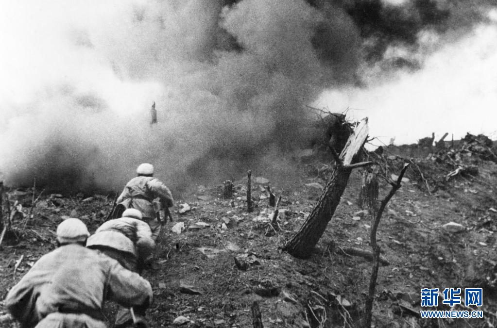 1952年,在上甘岭战役中,中国人民志愿军指战员在炮火支援下,攻上537.7高地北山。新华社发