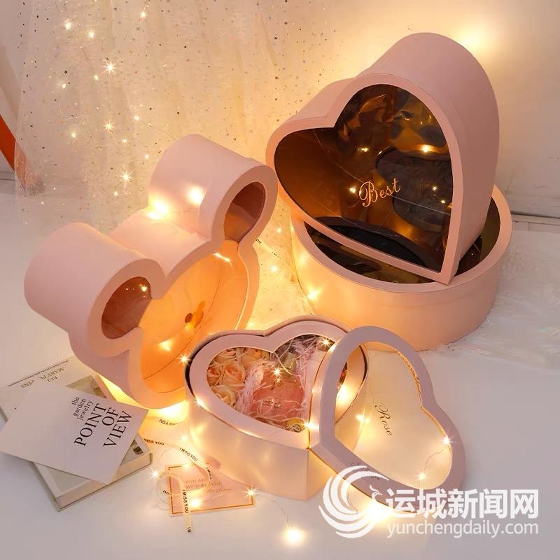 樊女士拿出一张印有“未来可‘七’ 满心欢‘夕’”的包装纸说:“你看看这上面印的文字,是不是很有情调。礼盒也是各式各样,不仅有心形、LOVE形,还有首饰盒、抱抱桶、手提袋等新式礼盒,既漂亮还实用,非常吸引人,当然需要额外购买,成本也会更高一些。”