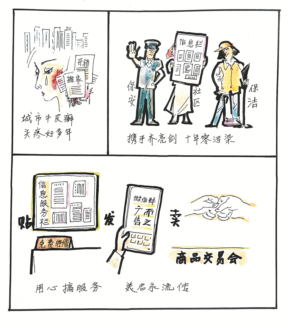 “贴”,即小区共设置了7个便民宣传栏,所有商户可在此张贴广告宣传页,居民也可张贴房屋出售或出租等信息。