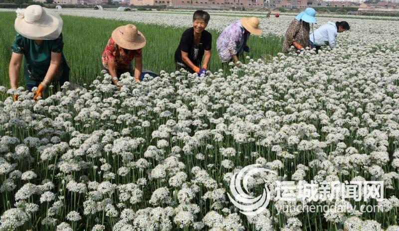 8月15日,闻喜县桐城镇东河口村村民在采摘韭花,准备发往市场。