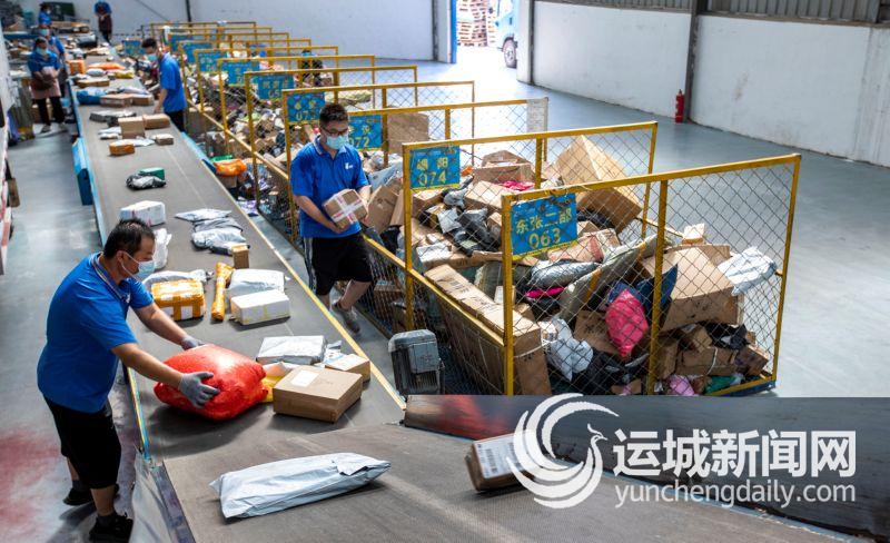 临猗县电商物流仓储配送中心的员工在分拣快递包裹