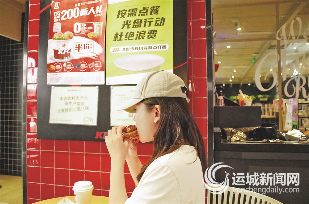 8月16日,在市区万达广场肯德基餐厅的墙壁上,“按需点餐 光盘行动 杜绝浪费”“请将未食用完餐点打包”宣传提示语清晰可见。市民梁佳根据自己平日的食量点了餐,她说:“一走进店里,我就看到了标语,时刻警醒自己不要浪费食物,我用餐时都会结合自己的饭量点餐,很少会出现浪费的情况。”