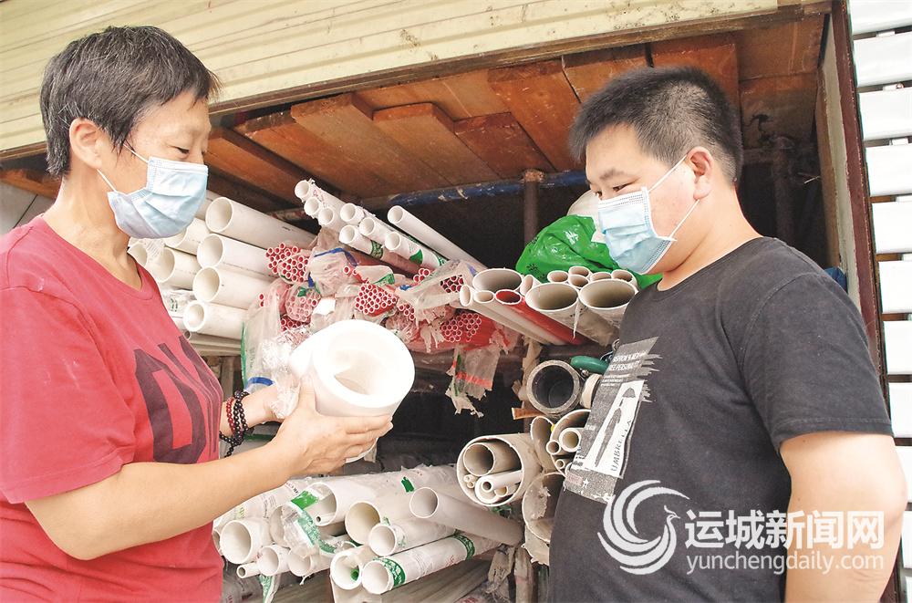 商家(左)向顾客讲解环保水管